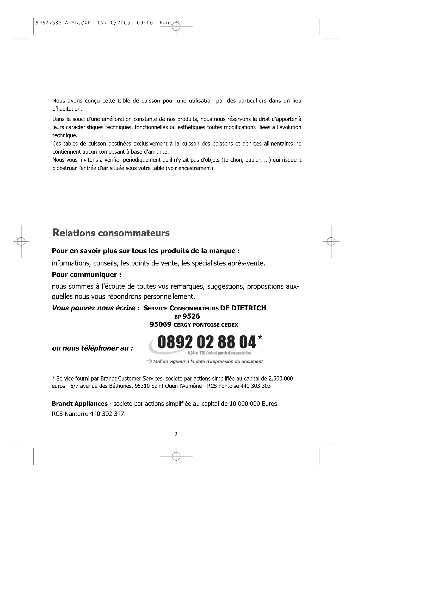 99627385_A_ML.QXP 07/10/2005 09:00 Page 12 Nous avons conçu cette table de cuisson pour une utilisation par des particuliers dans un lieud’habitation.Dans le souci d’une amélioration constante de nos produits, nous nous réservons le droit d’apporter àleurs caractéristiques techniques, fonctionnelles ou esthétiques toutes modifications liées à l’évolutiontechnique.Ces tables de cuisson destinées exclusivement à la cuisson des boissons et denrées alimentaires necontiennent aucun composant à base d’amiante.Nous vous invitons à vérifier périodiquement qu'il n'y ait pas d’objets (torchon, papier, ...) qui risquentd'obstruer l’entrée d’air située sous votre table (voir encastrement). Pour en savoir plus sur tous les produits de la marque : informations, conseils, les points de vente, les spécialistes après-vente. Pour communiquer : nous sommes à l’écoute de toutes vos remarques, suggestions, propositions aux- quelles nous vous répondrons personnellement. Vous pouvez nous écrire : SERVICE