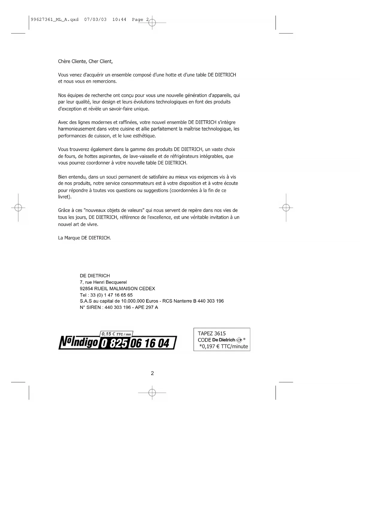 - TAPEZ 3615 CODE * *0,197 € TTC/minute DE DIETRICH7, rue Henri Becquerel92854 RUEIL MALMAISON CEDEXTel : 33 (0) 1 47 16 65 65S.A.S au capital de 10.000.000 Euros - RCS Nanterre B 440 303 196N° SIREN : 440 303 196 - APE 297 A 99627361_ML_A.qxd 07/03/03 10:44 Page 2tout au long de la notice, vous signale les consignes de sécurité, vous signale les conseils et les astuces Votre duo en toute sécurité p. 5