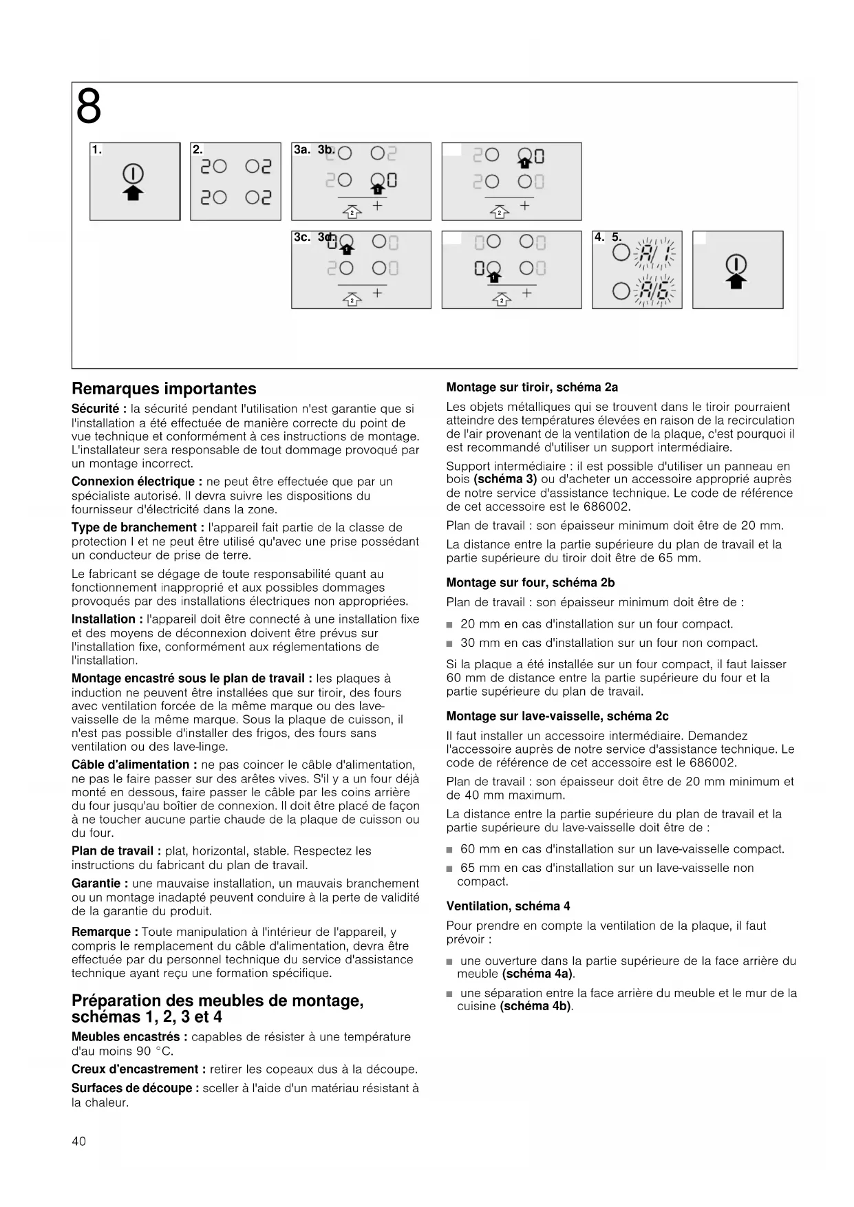 /40 Remarques importantes Sécurité : la sécurité pendant l'utilisation n'est garantie que si l'installation a été effectuée de manière correcte du point de vue technique et conformément à ces instructions de montage. L'installateur sera responsable de tout dommage provoqué par un montage incorrect. Connexion électrique : ne peut être effectuée que par un spécialiste autorisé. Il devra suivre les dispositions du fournisseur d'électricité dans la zone. Type de branchement : l'appareil fait partie de la classe de protection I et ne peut être utilisé qu'avec une prise possédant un conducteur de prise de terre. Le fabricant se dégage de toute responsabilité quant au fonctionnement inapproprié et aux possibles dommages provoqués par des installations électriques non appropriées. Installation : l'appareil doit être connecté à une installation fixe et des moyens de déconnexion doivent être prévus sur l'installation fixe, conformément aux réglementations de l'installation. Montage encastré sous le plan de travail : les plaques à induction ne peuvent être installées que sur tiroir, des fours avec ventilation forcée de la même marque ou des lave- vaisselle de la même marque. Sous la plaque de cuisson, il n'est pas possible d'installer des frigos, des fours sans ventilation ou des lave-linge. Câble d'alimentation : ne pas coincer le câble d'alimentation, ne pas le faire passer sur des arêtes vives. S'il y a un four déjà monté en dessous, faire passer le câble par les coins arrière du four jusqu'au boîtier de connexion. Il doit être placé de façon à ne toucher aucune partie chaude de la plaque de cuisson ou du four. Plan de travail : plat, horizontal, stable. Respectez les instructions du fabricant du plan de travail. Garantie : une mauvaise installation, un mauvais branchement ou un montage inadapté peuvent conduire à la perte de validité de la garantie du produit. Remarque : Toute manipulation à l'intérieur de l'appareil, y compris le remplacement du câble d'alimentation, devra être effectuée par du personnel technique du service d'assistance technique ayant reçu une formation spécifique. Préparation des meubles de montage, schémas 1, 2, 3 et 4 Meubles encastrés : capables de résister à une température d'au moins 90 °C. Creux d'encastrement : retirer les copeaux dus à la découpe. Surfaces de découpe : sceller à l'aide d'un matériau résistant à la chaleur. Montage sur tiroir, schéma 2a Les objets métalliques qui se trouvent dans le tiroir pourraient atteindre des températures élevées en raison de la recirculation de l'air provenant de la ventilation de la plaque, c'est pourquoi il est recommandé d'utiliser un support intermédiaire. Support intermédiaire : il est possible d'utiliser un panneau en bois (schéma 3) ou d'acheter un accessoire approprié auprès de notre service d'assistance technique. Le code de référence de cet accessoire est le 686002. Plan de travail : son épaisseur minimum doit être de 20 mm. La distance entre la partie supérieure du plan de travail et la partie supérieure du tiroir doit être de 65 mm. Montage sur four, schéma 2b Plan de travail : son épaisseur minimum doit être de : ■ 20 mm en cas d'installation sur un four compact. ■ 30 mm en cas d'installation sur un four non compact. Si la plaque a été installée sur un four compact, il faut laisser 60 mm de distance entre la partie supérieure du four et la partie supérieure du plan de travail. Montage sur lave-vaisselle, schéma 2c Il faut installer un accessoire intermédiaire. Demandez l'accessoire auprès de notre service d'assistance technique. Le code de référence de cet accessoire est le 686002. Plan de travail : son épaisseur doit être de 20 mm minimum et de 40 mm maximum. La distance entre la partie supérieure du plan de travail et la partie supérieure du lave-vaisselle doit être de : ■ 60 mm en cas d'installation sur un lave-vaisselle compact. ■ 65 mm en cas d'installation sur un lave-vaisselle non compact. Ventilation, schéma 4 Pour prendre en compte la ventilation de la plaque, il faut prévoir : ■ une ouverture dans la partie supérieure de la face arrière du meuble (schéma 4a). ■ une séparation entre la face arrière du meuble et le mur de la cuisine (schéma 4b).