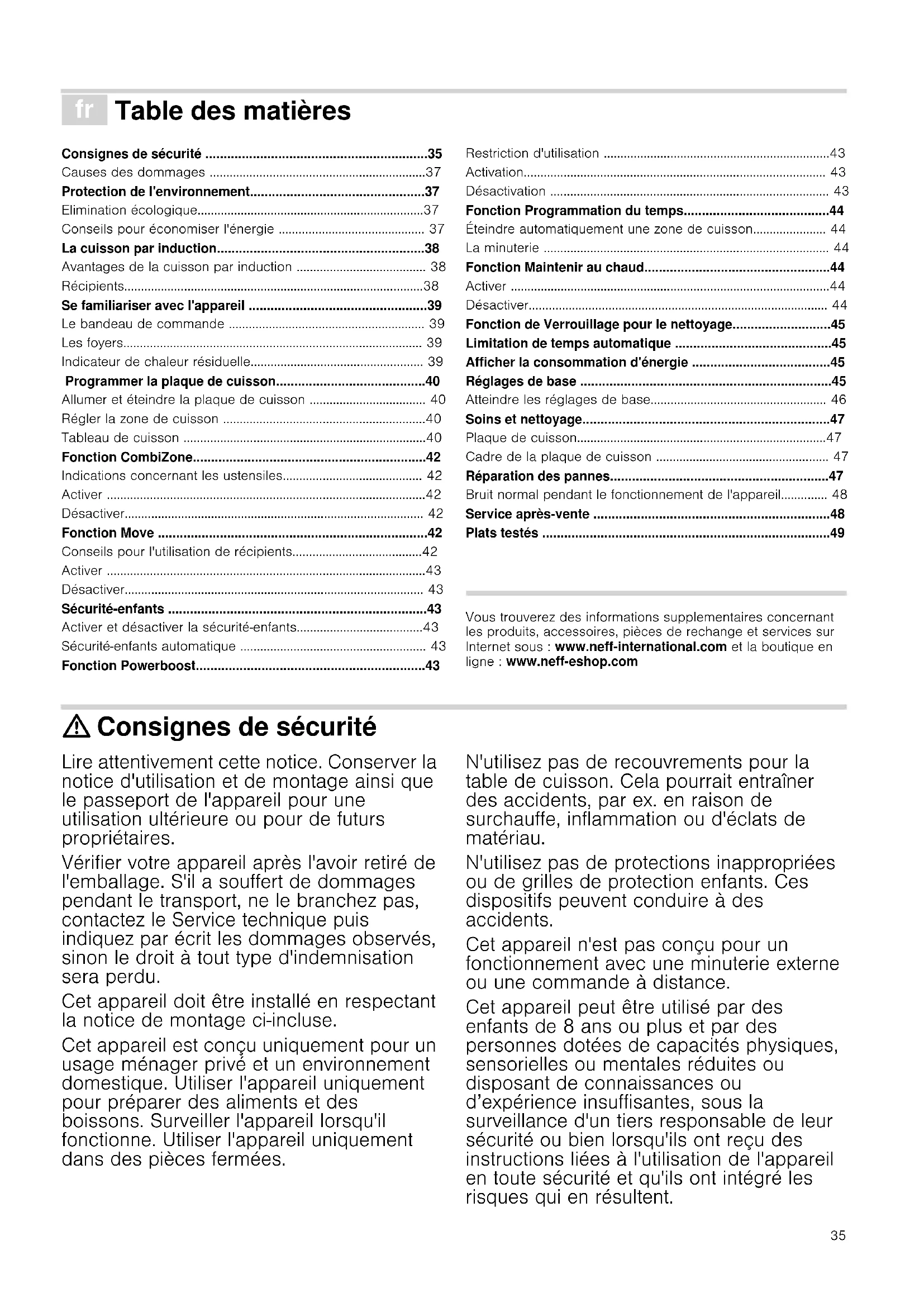 - Plats testés Produktinfo Vous trouverez des informations supplementaires concernant les produits, accessoires, pièces de rechange et services sur Internet sous : www.neff-international.com et la boutique en ligne : www.neff-eshop.com : Consignes de sécurité Lire attentivement cette notice. Conserver la notice d'utilisation et de montage ainsi que le passeport de l'appareil pour une utilisation ultérieure ou pour de futurs propriétaires. Vérifier votre appareil après l'avoir retiré de l'emballage. S'il a souffert de dommages pendant le transport, ne le branchez pas, contactez le Service technique puis indiquez par écrit les dommages observés, sinon le droit à tout type d'indemnisation sera perdu. Cet appareil doit être installé en respectant la notice de montage ci-incluse. Cet appareil est conçu uniquement pour un usage ménager privé et un environnement domestique. Utiliser l'appareil uniquement pour préparer des aliments et des boissons. Surveiller l'appareil lorsqu'il fonctionne. Utiliser l'appareil uniquement dans des pièces fermées. N'utilisez pas de recouvrements pour la table de cuisson. Cela pourrait entraîner des accidents, par ex. en raison de surchauffe, inflammation ou d'éclats de matériau. N'utilisez pas de protections inappropriées ou de grilles de protection enfants. Ces dispositifs peuvent conduire à des accidents. Cet appareil n'est pas conçu pour un fonctionnement avec une minuterie externe ou une commande à distance. Cet appareil peut être utilisé par des enfants de 8 ans ou plus et par des personnes dotées de capacités physiques, sensorielles ou mentales réduites ou disposant de connaissances ou d’expérience insuffisantes, sous la surveillance d'un tiers responsable de leur sécurité ou bien lorsqu'ils ont reçu des instructions liées à l'utilisation de l'appareil en toute sécurité et qu'ils ont intégré les risques qui en résultent.36 Les enfants ne doivent pas jouer avec l'appareil. Le nettoyage et l'entretien effectué par l'utilisateur ne doivent pas être accomplis par des enfants, sauf s'ils sont âgés de 8 ans et plus et qu'un adulte les surveille. Les enfants de moins de 8 ans doivent être tenus à distance de l'appareil et du cordon d'alimentation. Les personnes portant un stimulateur cardiaque ou un dispositif médical similaire doivent prêter une attention toute particulière lorsqu'elles utilisent des plaques de cuisson à induction ou qu'elles se trouvent à proximité de plaques de cuisson à induction en fonctionnement. Consulter un médecin ou le fabricant du dispositif pour s'assurer que celui-ci est conforme à la réglementation en vigueur et en connaître les incompatibilités éventuelles. Risque d'incendie ! p. 49