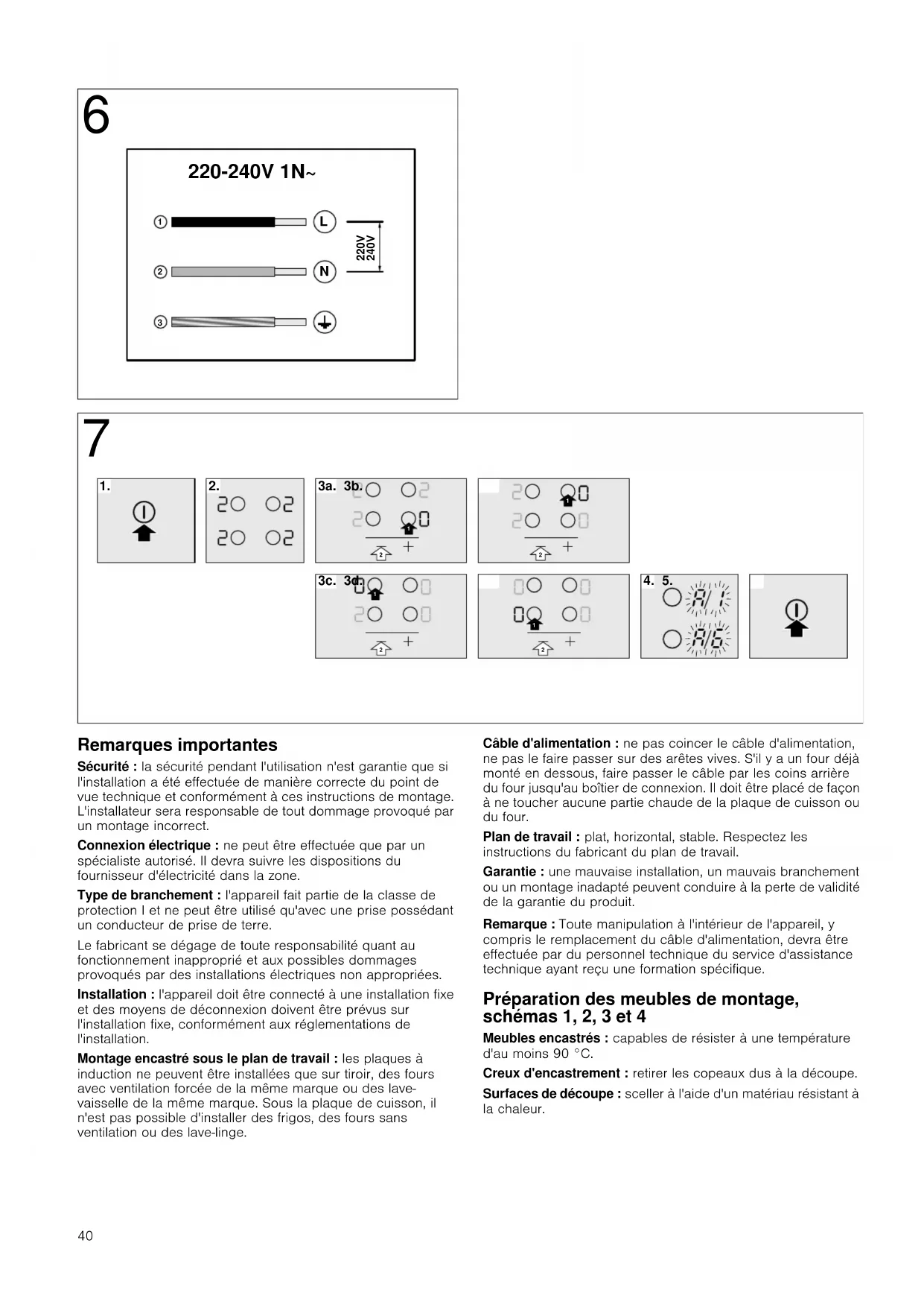 Remarques importantes Sécurité : la sécurité pendant l'utilisation n'est garantie que si l'installation a été effectuée de manière correcte du point de vue technique et conformément à ces instructions de montage. L'installateur sera responsable de tout dommage provoqué par un montage incorrect. Connexion électrique : ne peut être effectuée que par un spécialiste autorisé. Il devra suivre les dispositions du fournisseur d'électricité dans la zone. Type de branchement : l'appareil fait partie de la classe de protection I et ne peut être utilisé qu'avec une prise possédant un conducteur de prise de terre. Le fabricant se dégage de toute responsabilité quant au fonctionnement inapproprié et aux possibles dommages provoqués par des installations électriques non appropriées. Installation : l'appareil doit être connecté à une installation fixe et des moyens de déconnexion doivent être prévus sur l'installation fixe, conformément aux réglementations de l'installation. Montage encastré sous le plan de travail : les plaques à induction ne peuvent être installées que sur tiroir, des fours avec ventilation forcée de la même marque ou des lave- vaisselle de la même marque. Sous la plaque de cuisson, il n'est pas possible d'installer des frigos, des fours sans ventilation ou des lave-linge. Câble d'alimentation : ne pas coincer le câble d'alimentation, ne pas le faire passer sur des arêtes vives. S'il y a un four déjà monté en dessous, faire passer le câble par les coins arrière du four jusqu'au boîtier de connexion. Il doit être placé de façon à ne toucher aucune partie chaude de la plaque de cuisson ou du four. Plan de travail : plat, horizontal, stable. Respectez les instructions du fabricant du plan de travail. Garantie : une mauvaise installation, un mauvais branchement ou un montage inadapté peuvent conduire à la perte de validité de la garantie du produit. Remarque : Toute manipulation à l'intérieur de l'appareil, y compris le remplacement du câble d'alimentation, devra être effectuée par du personnel technique du service d'assistance technique ayant reçu une formation spécifique. Préparation des meubles de montage, schémas 1, 2, 3 et 4 Meubles encastrés : capables de résister à une température d'au moins 90 °C. Creux d'encastrement : retirer les copeaux dus à la découpe. Surfaces de découpe : sceller à l'aide d'un matériau résistant à la chaleur.