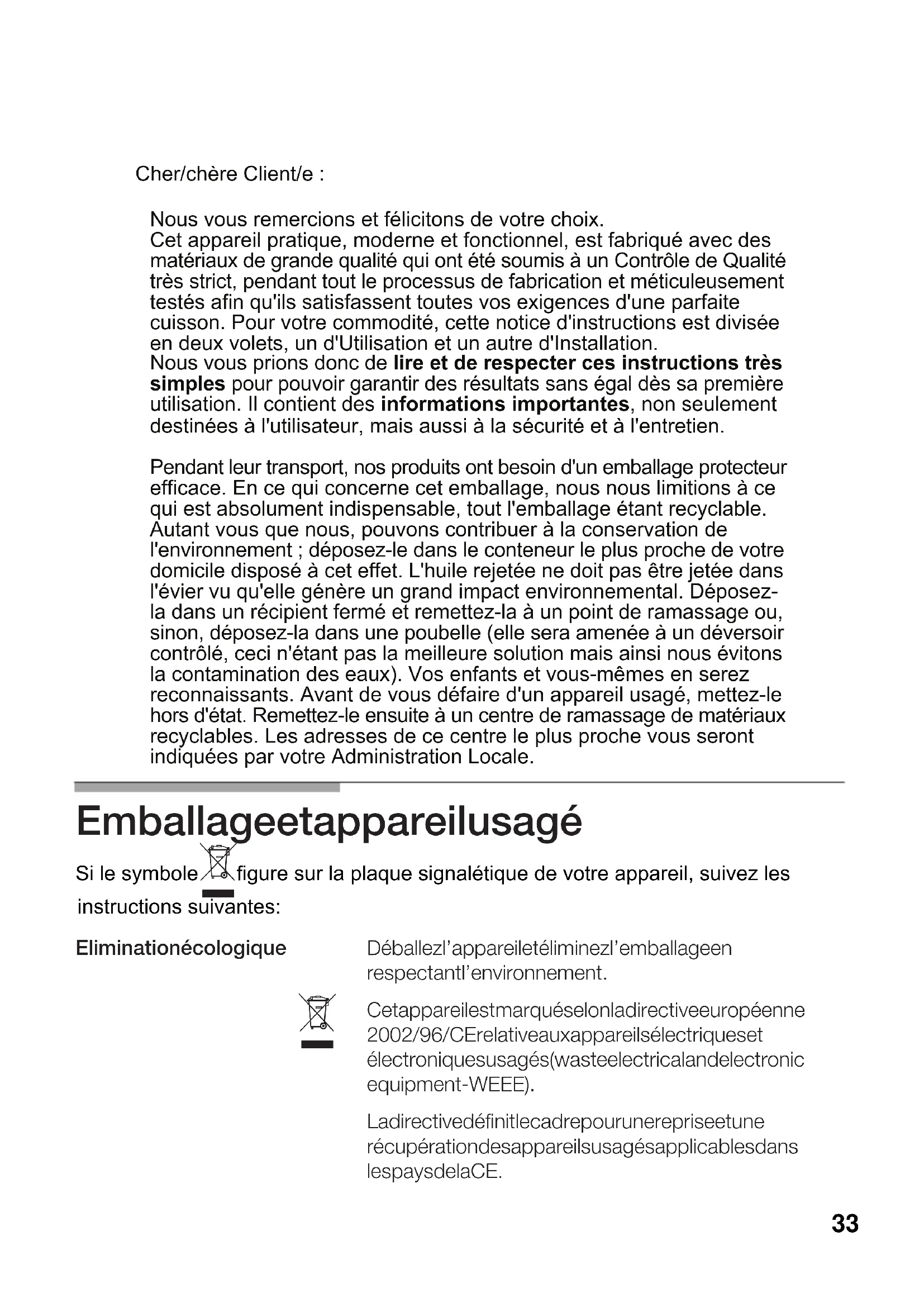 'Protectiontrop élevée).Température trop élevée (voir commande de la minuterie).Raccordement de lappareil au réseau électrique / Défaillance du réseau électriqueBlocage des boutons de commande de (voir Protection contre une défaillance du la minuterie (voir Blocage des boutons de réseau électrique). contre une températureAvertissements d'utilisation quant à la préparation NON OUI Utilisez toujours des récipients appropriés à chaque brûleur, vous éviterez ainsi de consommer excessivement du gaz et de tacher les récipients. Placez toujours le couvercle. Placez le récipient sur la grille. Assurez-vous que les grilles et les couvercles des brûleurs sont bien placés avant de les utiliser. Manipulez soigneusement les récipients sur la table de cuisson. N'utilisez pas de récipients petits sur des brûleurs grands. La flamme ne doit pas toucher les côtés du récipient. Ne cuisinez pas sans couvercle ou avec le couvercle décentré, une partie de l'énergie est ainsi perdue. N'utilisez pas de récipients ayant des fonds irréguliers, ils rallongent le temps de cuisson et augmentent la consommation d'énergie. Ne placez pas le récipient décentré sur le brûleur, il pourrait se renverser. N'utilisez pas de récipients de grand diamètre sur les brûleurs situés près des commandes, qui une fois décentrés sur le brûleur peuvent les toucher et en s'approchant augmenter la température de cette zone et causer des dommages. Ne placez pas les récipients directement sur le brûleur. N'utilisez pas de poids excessifs, ne frappez pas la table de cuisson avec des objets lourds. N'utilisez pas deux brûleurs ou sources de chaleur pour un seul récipient. Evitez d'utiliser des grills de rôtissage, casseroles en terre, etc., de manière prolongée à puissance maximum. Utilisez un seul récipient par brûleur. N'utilisez que des marmites, poêles et casseroles avec un fond plat et épais. Placez le récipient bien centré sur le brûleur. Double flamme. supplementaire Utilisez la grille 46Normes d'utilisation pour la plaque en verre : Nettoyage et conservation Avec le râcloir à verre, retirez immédiatement les aliments qui ont débordé. Ceci vaut en particulier pour les aliments fondus, pour le sucre et les aliments contenant beaucoup de sucre. la présence de gouttes d'eau ou de zones humides au début de la cuisson peut provoquer Faites attention aux chevilles des grilles quand vous les nettoyez, elles pourraient se détacher et rayer la plaque en verre ou le profilé avec la grille lors de son utilisation suivante. Nettoyez la surface de l'élément chauffant quand il est froid après chaque utilisation. Même les petites saletés brûlent à nouveau en le connectant une autre fois. Pour maintenir propres les brûleurs et les grilles, il faut les nettoyer régulièrement en les plongeant dans de l'eau savonneuse et en les frottant à l'aide d'une brosse non métallique afin que les trous et les rainures soient parfaitement libres pour fournir une flamme correcte. Séchez les couvercles des brûleurs et des grilles à chaque fois qu'ils ont été mouillés. Utilisez une raclette pour verre, et toujours de manière plate sur la plaque en verre, en faisant particulièrement attention de ne pas l'approcher des caches des brûleurs de gaz. Pour le nettoyage nous vous recommandons " Vitro Clen ". Le pourcentage élevé de silicone de ce produit forme un film ; c'est pourquoi il est plus facile de le retirer. De plus, il est important de suivre les soins de manière régulière. Après le nettoyage et le séchage des brûleurs, assurez-vous que les couvercles sont bien placés sur le diffuseur de flamme du brûleur. NON OUI N'utilisez pas de détergents en poudre, de sprays pour le nettoyage de fours ou d'éponges abrasives pouvant rayer le verre. Ne faites pas glisser sur le verre les récipients vu qu'il peut se rayer. De plus, évitez les chutes d'objets durs ou pointus sur la plaque en verre. Ne frappez pas la table. Les grains de sable, par exemple ceux provenant du nettoyage de légumes, rayent la surface de la plaque en verre. N'employez jamais d'objets pointus comme des lavettes métalliques ou des couteaux pour retirer des restes d'aliments durcis sur la surface. N'utilisez pas de couteau, raclette ou objet similaire pour nettoyer l'union de la plaque en verre et des caches des brûleurs ou des profilés embellisseurs métalliques. ATTENTION: Après avoir lavé les grilles, séchez-les complètement avant de cuisiner à nouveau avec elles, d'éventuels points de détérioration de l'émail. Faites attention à ne endommager les pivots qui fixent les grilles en retirant ces dernières pas 47Situations anormales Il n'est pas toujours nécessaire d'appeler le service après-vente. Très souvent, vous pouvez les résoudre vous-mêmes. Le tableau suivant contient quelques conseils. Remarque importante : Seul le personnel autorisé de notre Service Technique peut effectuer des travaux sur le système de fonctionnement de gaz et électrique. Conditions de garantie Les conditions de garantie applicables à cet appareil sont celles établies par la représentation de notre entreprise dans le pays où l'achat a été effectué. Si vous le souhaitez, le vendeur de l'appareil sera à votre entière disposition pour vous fournir des détails sur cet aspect. Dans tous les cas, pour profiter de la garantie, il faudra présenter le ticket d'achat. Tout droit de modification réservé. Si vous devez appeler notre Service Technique, veuillez indiquer : E - NR FD Ces indications figurent sur la plaque signalétique de votre appareil. Cette plaque est située sur la partie inférieure de votre table de cuisson. ...si le fonctionnement électrique est en panne ? -Fusible défectueux. -Contrôler le fusible sur le boîtier général des fusibles et le remplacer s'il est en panne. -L'automatique ou un différentiel d'installation a pu se déclencher. -Vérifiez dans le boîtier généra