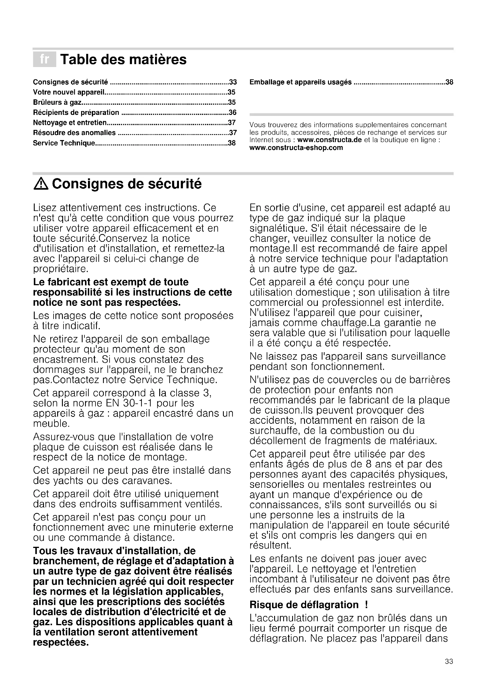 - Csomagolás és használt készülék Produktinfo További információkat a termékekről, a tartozékokról, az alkatrészekről és a szervizzel kapcsolatban internetes oldalunkon: www.constructa.de és az Online-Shop-ban: www.constructa-eshop.com talál. : Biztonsági előírások Olvassa el figyelmesen a következő utasításokat. Csak ezt követően tudja a készüléket hatékonyan és biztonsággal használni. Őrizze meg a használati és beszerelési útmutatót, és az esetleges új tulajdonosnak a készülékkel együtt adja át azokat. A kézikönyv utasításainak figyelmen kívül hagyása esetén a gyártót semmilyen felelősség nem terheli. A használati utasításban szereplő képek tájékoztató jellegűek. A készüléket csak az üzembe helyezéskor vegye ki a védőcsomagolásból. Ha bármilyen sérülést észlel a készüléken, ne csatlakoztassa azt. Lépjen kapcsolatba vevőszolgálatunkkal. Ez a készülék a gázkészülékekre vonatkozó EN 30-1-1-es szabvány szerinti 3. osztályba sorolandó: bútorba beépített készülék. Az új főzőlap beszerelése előtt bizonyosodjon meg arról, hogy az üzembe helyezés a beszerelési útmutató szerint történik. A készüléket tilos jachton vagy lakókocsiban üzembe helyezni. Ez a készülék kizárólag megfelelően szellőző helyiségekben használható. A készülék külső időkapcsolóval vagy távirányítással való üzemeltetésre nem alkalmas. A beszereléssel, csatlakoztatással, beállítással és más típusú gázra való átállítással kapcsolatos szerelést megfelelően képzett szakembernek kell végeznie, az érvényben lévő szabályok és a helyi gáz- és áramszolgáltatók előírásainak betartásával. A szellőzésre vonatkozó előírásokra kiemelt figyelmet kell fordítani. A készüléket a gyártás során adott, a műszaki adatlapon jelölt gáztípus használatára állították be. Ha módosításra van szükség, kérjük, olvassa el a beszerelési útmutatóban található információkat. Más típusú gázra való átállítás esetén kérjük, hogy forduljon vevőszolgálatunkhoz. Ezt a készüléket kizárólag háztartásban történő használatra tervezték. Kereskedelmi és nagyüzemi használata nem megengedett. A készüléket kizárólag ételek készítésére használja, soha ne fűtésre. A jótállás kizárólag rendeltetésszerű használat esetén érvényes. Működés közben a készüléket ne hagyja felügyelet nélkül. Csak olyan fedőt vagy gyermekbiztonsági védőelemet használjon, melyet a főzőlap gyártója jóváhagyott. Balesetveszély áll fenn, például a túlmelegedés, meggyulladás vagy darabok leválása miatt. A készüléket 8 év feletti gyerekek és csökkent fizikai, érzékszervi vagy szellemi képességű, ill. tapasztalatlan személyek csak felügyelet mellett használhatják, illetve akkor, ha megtanulták a készülék biztonságos használatát és megértették az ebből eredő veszélyeket. Soha ne engedjen gyerekeket a készülékkel játszani. A tisztítást és a felhasználói karbantartást soha nem végezhetik gyerekek felügyelet nélkül. Gyulladásveszély! A gáz elégés nélkül felhalmozódása zárt helyiségben gyulladásveszéllyel jár. Ne helyezze a készüléket huzatos helyre. Az égők lángja kialudhat. Olvassa el figyelmesen a gázrózsák működésére vonatkozó utasításokat és figyelmeztetéseket.40 Gázmérgezés veszélye! A gáztűzhely használata a helyiségben meleget, párát és égéstermékeket eredményez. Biztosítsa a konyha megfelelő szellőzését, főként a főzőlap működtetése során: hagyja nyitva a természetes szellőzést biztosító nyílásokat, vagy szereltessen be egy mechanikus szellőztető készüléket (elszívó kürtőt). Ha a készüléket nagy teljesítményen vagy hosszú időn át használja, kiegészítő vagy hatékonyabb szellőzésre lehet szükség: nyisson ablakot, vagy növelje a mechanikus szellőztető teljesítményét. Égésveszély! A főzőfelületek és a készülék környezetében található bútorok felforrósodnak. Ne érintse meg a forró felületeket. A 8 éven aluli gyermekeket tartsa távol a készüléktől. Tűzveszély! p. 44