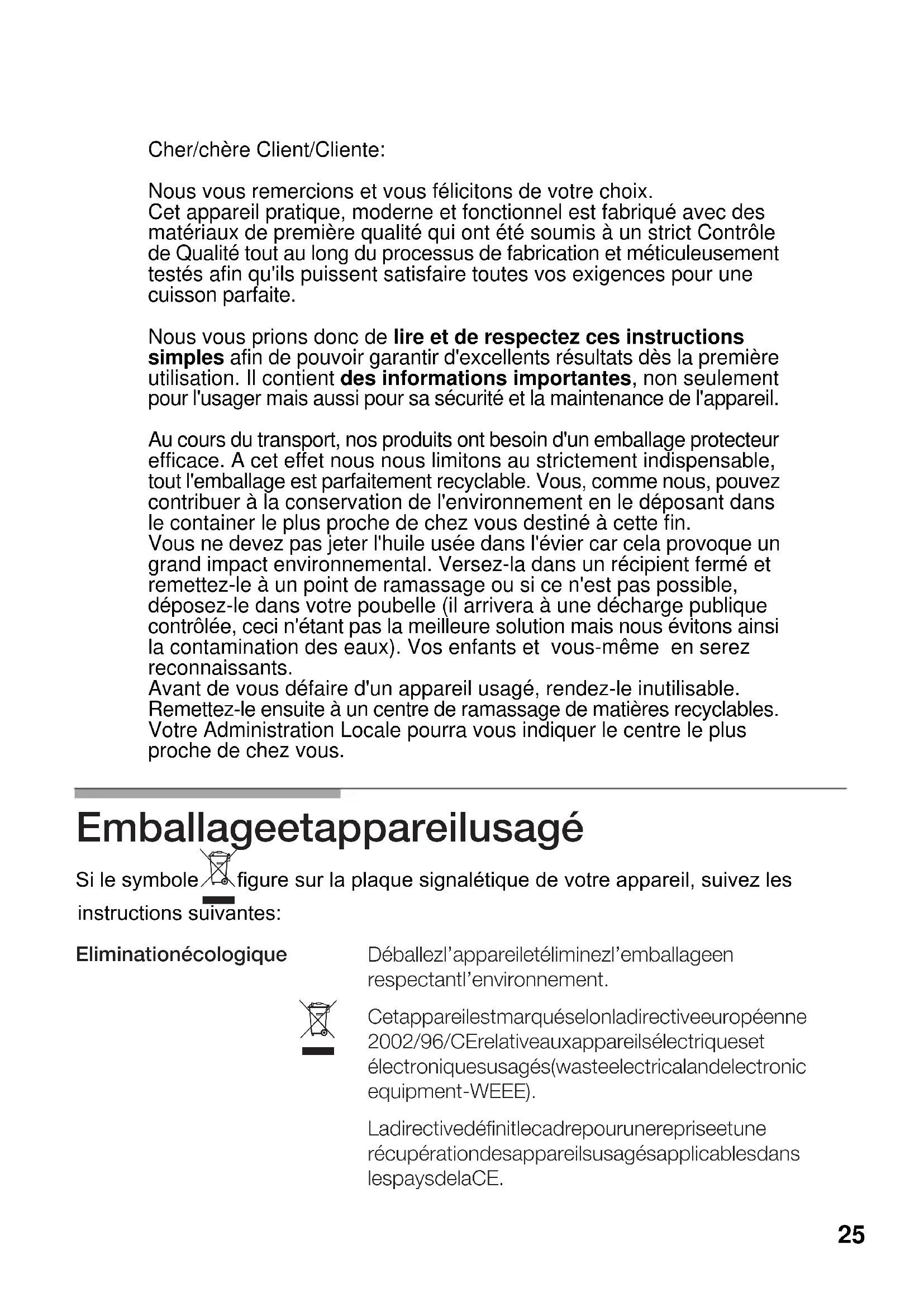 N’utilisez pas de petits récipients sur les grands brûleurs.La flamme ne doit pas toucher les bords latéraux du récipient. Ne cuisinez pas sans couvercle,ou avec le couvercle déplacé, car une partie de l'énergie est ainsi gaspillée. N’utilisez pas de récipients aux fonds irréguliers, ils augmentent le temps de cuisson et la consommation d'énergie. Ne posez pas le récipient sans le centrer sur le brûleur, il pourrait se renuerser. N'utilisez pas de récipients au diamètre important prés des commandes, récipients qui une fois centrés sur le brûleur pourraient toucher les commandes ou s´en approcher autant que la température de cette zone augmenterait et pourrait provoquer des dommages. Ne posez pas les récipients directement sur le brûleur. N'utilisez pas de poids excessifs, ni frappez la plaque de cuisson avec des objets lourds. Utilisez toujours des récipients appropriés à chaque brûleur, vous éviterez ainsi una consommation excessive de gaz et de salir les récipients. Posez toujours le couvercle. Utilisez seulement des autocuiseurs, poêles et casseroles au fond plat et épais. Bien centrer le récipient sur le brûleur. Posez le récipient sur la grille. Maniez les récipients avec précaution sur la plaque de cuisson. Avertissements d'usage concernant la cuisson: Avertissements d'usage concernant la cuisson: Avertissements d'usage concernant la cuisson: Avertissements d'usage concernant la cuisson: Avertissements d'usage concernant la cuisson: Avertissements d'usage concernant la cuisson: NON OUIEn ce qui concerne le nettoyage et la conservation: Si son utilisation prolongée a éliminé le revêtement des plaques électriques, arrosez- les avec quelques gouttes d'huile ou autre produit de maintenance, utilisés sur le marché. Etant données les hautes températures que doit supporter le couvercle de l’anneau du brûleur à triple flamme ainsi que les zones en acier inoxydable telles que: anneaux des plaques, lèchefrites, contour des brûleurs, etc... elles arrivent à se décolorer avec le temps. C’est NORMAL. Nettoyez-les après chaque utilisation avec un produit approprié pour acier inoxydable. Après avoir lavé les grilles, séchez-les complètement avant de recommencer à cuisiner avec elles. L’essence de gouttes d'eau ou de zones humides en début de cuisson peut occasionner d’éventuels points de détérioration de l’émail. Si les grilles de votre plaque de cuisson disposent de taquets en caoutchouc, prenez soin lorsque vous les nettoyez, qu’ils ne se détachent pas, la grille se retrouverait sans protection et rayerait la plaque de cuisson. Un nettoyant pour acier inoxydable ne doit pas être utilisé pour la zone autour des commandes. Les indications (sérigraphie) pourraient s’effacer.
