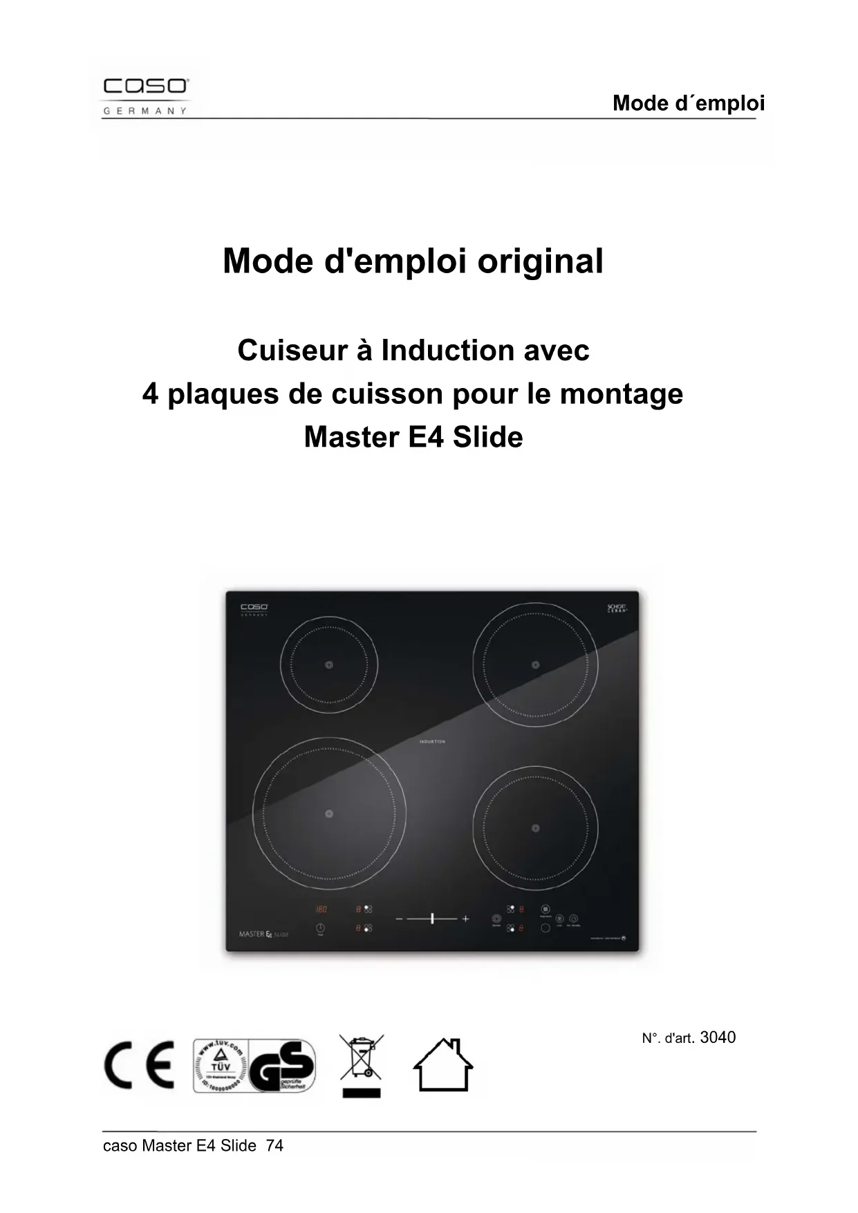 28 Garantie Sur ce produit nous accordons une garantie de 24 mois à partir de la date d'achat pour les manques et les défauts de fabrication ou de matériaux. Vous conserver entièrement vos droits de garantie légale accordés par le §439 et suivants BGB-E. La garantie ne concerne pas les dégâts causés par une utilisation ou une manipulation non conforme, ainsi que les défauts qui n'influencent que faiblement le fonctionnement ou la valeur de l'appareil. D'autre part ne sont pas garantis également les pièces d'usure, les dommages de transport dans la mesure où ils ne sont pas sous notre responsabilité, ainsi que les dommages occasionnés par des réparations qui n'ont pas été effectuées par nos soins. La construction et la puissance de cet appareil sont conçues pour un usage ménager privé. Un éventuel usage commercial reste couvert par la garantie dans la mesure où cette utilisation ne dépasse pas le cadre des contraintes d'un usage privé. L'appareil n'est pas prévu pour un usage commercial plus intensif. En cas de recours en garantie justifié nous déciderons de réparer l'appareil ou de le remplacer par un appareil sans défaut.Structure et fonctionnement caso Master E4 Slide 103 Les manques doivent être signalés dans un délai de 14 jours après livraison. Tout autre recours est sans objet. Pour tout recours en garantie nous vous prions d'entrer en contact avec nos services avant de nous retourner l'appareil (toujours avec le bon d'achat!). 29 Caractéristiques techniques Appareil Cuiseur à induction avec 4 plaques de cuisson pour montage Nom Master E4 Slide Modèle MC-IF7219G N°. d'article 3040 Données de raccordement 6,4-7,2 kW /400 V Puissance consommée 6400 Watt / max. 7200 Watt Dimensions externes (I/H/T) 590 x 55 x 560 mm Dimensions montage 560 x 51 x 490 mm Poids net 14,0 kgIstruzione d´uso caso Master E4 Slide 104 Istruzioni d’uso originali Cucina a induzione con 4 piastre di cottura - installazione Master E4 Slide Articolo-N. 3040In generale caso Master E4 Slide 105 30 Istruzione d´uso
