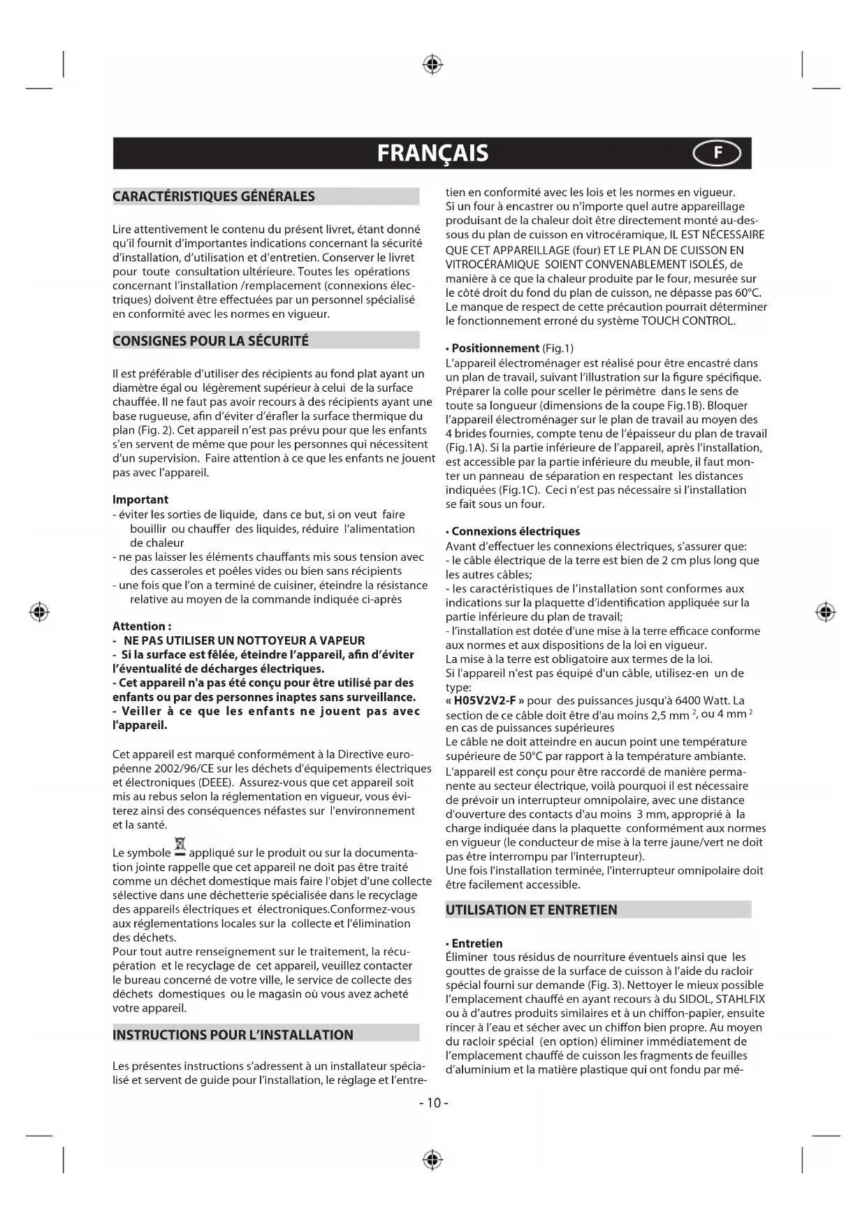 Il est préférable d’utiliser des récipients au fond plat ayant un diamètre égal ou légèrement supérieur à celui de la surface chauffée. Il ne faut pas avoir recours à des récipients ayant une base rugueuse, afin d’éviter d’érafler la surface thermique du plan (Fig. 2). Cet appareil n’est pas prévu pour que les enfants s’en servent de même que pour les personnes qui nécessitent d’un supervision. Faire attention à ce que les enfants ne jouent pas avec l’appareil. Important - éviter les sorties de liquide, dans ce but, si on veut faire bouillir ou chauffer des liquides, réduire l’alimentation de chaleur - ne pas laisser les éléments chauffants mis sous tension avec des casseroles et poêles vides ou bien sans récipients - une fois que l’on a terminé de cuisiner, éteindre la résistance relative au moyen de la commande indiquée ci-après Attention : - NE PAS UTILISER UN NOTTOYEUR A VAPEUR - Si la surface est fêlée, éteindre l’appareil, afin d’éviter l’éventualité de décharges électriques. - Cet appareil n'a pas été conçu pour être utilisé par des enfants ou par des personnes inaptes sans surveillance. - Veiller à ce que les enfants ne jouent pas avec l'appareil. Cet appareil est marqué conformément à la Directive euro- péenne 2002/96/CE sur les déchets d'équipements électriques et électroniques (DEEE). Assurez-vous que cet appareil soit mis au rebus selon la réglementation en vigueur, vous évi- terez ainsi des conséquences néfastes sur l'environnement et la santé. Le symbole appliqué sur le produit ou sur la documenta- tion jointe rappelle que cet appareil ne doit pas être traité comme un déchet domestique mais faire l'objet d'une collecte sélective dans une déchetterie spécialisée dans le recyclage des appareils électriques et électroniques.Conformez-vous aux réglementations locales sur la collecte et l'élimination des déchets. Pour tout autre renseignement sur le traitement, la récu- pération et le recyclage de cet appareil, veuillez contacter le bureau concerné de votre ville, le service de collecte des déchets domestiques ou le magasin où vous avez acheté votre appareil.