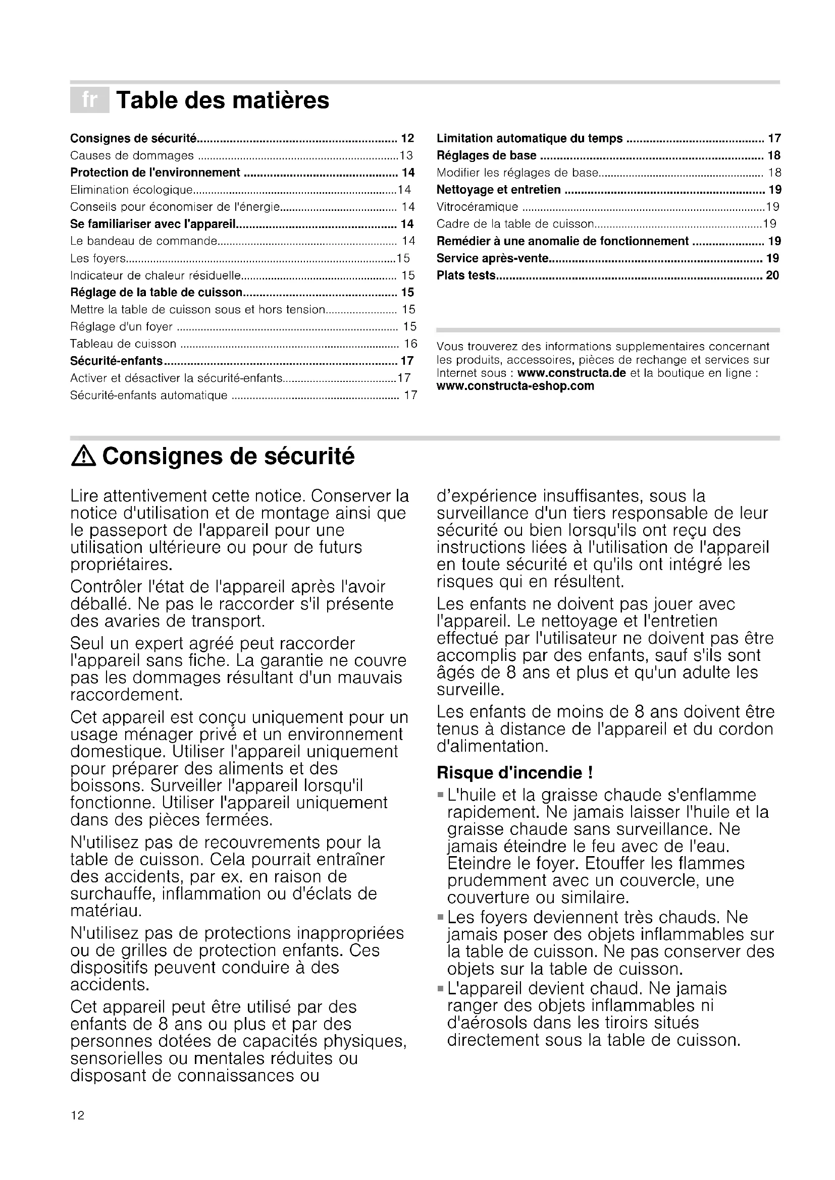 - Plats tests Produktinfo Vous trouverez des informations supplementaires concernant les produits, accessoires, pièces de rechange et services sur Internet sous : www.constructa.de et la boutique en ligne : www.constructa-eshop.com : Consignes de sécurité Lire attentivement cette notice. Conserver la notice d'utilisation et de montage ainsi que le passeport de l'appareil pour une utilisation ultérieure ou pour de futurs propriétaires. Contrôler l'état de l'appareil après l'avoir déballé. Ne pas le raccorder s'il présente des avaries de transport. Seul un expert agréé peut raccorder l'appareil sans fiche. La garantie ne couvre pas les dommages résultant d'un mauvais raccordement. Cet appareil est conçu uniquement pour un usage ménager privé et un environnement domestique. Utiliser l'appareil uniquement pour préparer des aliments et des boissons. Surveiller l'appareil lorsqu'il fonctionne. Utiliser l'appareil uniquement dans des pièces fermées. N'utilisez pas de recouvrements pour la table de cuisson. Cela pourrait entraîner des accidents, par ex. en raison de surchauffe, inflammation ou d'éclats de matériau. N'utilisez pas de protections inappropriées ou de grilles de protection enfants. Ces dispositifs peuvent conduire à des accidents. Cet appareil peut être utilisé par des enfants de 8 ans ou plus et par des personnes dotées de capacités physiques, sensorielles ou mentales réduites ou disposant de connaissances ou d’expérience insuffisantes, sous la surveillance d'un tiers responsable de leur sécurité ou bien lorsqu'ils ont reçu des instructions liées à l'utilisation de l'appareil en toute sécurité et qu'ils ont intégré les risques qui en résultent. Les enfants ne doivent pas jouer avec l'appareil. Le nettoyage et l'entretien effectué par l'utilisateur ne doivent pas être accomplis par des enfants, sauf s'ils sont âgés de 8 ans et plus et qu'un adulte les surveille. Les enfants de moins de 8 ans doivent être tenus à distance de l'appareil et du cordon d'alimentation. Risque d'incendie ! p. 20