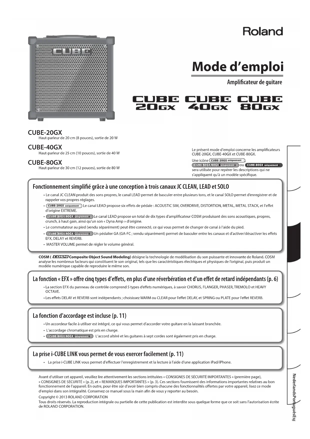 VOL MASTER VOL nur CUBE-80GX Only when a foot controller is connectedNederlandsPortuguêsEspañolItalianoFrançaisDeutschEnglish Mode d’emploi Amplicateur de guitare Avant d’utiliser cet appareil, veuillez lire attentivement les sections intitulées «CONSIGNES DE SÉCURITÉ IMPORTANTES» (première page), «CONSIGNES DE SÉCURITÉ» (p.2), et «REMARQUES IMPORTANTES» (p.3). Ces sections fournissent des informations importantes relatives au bon fonctionnement de l’appareil. En outre, pour être sûr d’avoir bien compris chacune des fonctionnalités oertes par votre appareil, lisez ce mode d’emploi dans son intégralité. Conservez ce manuel sous la main an de vous y reporter au besoin. Copyright © 2013 ROLAND CORPORATION Tous droits réservés. La reproduction intégrale ou partielle de cette publication est interdite sous quelque forme que ce soit sans l’autorisation écrite de ROLAND CORPORATION. La fonction d’accordage est incluse (p. 11)