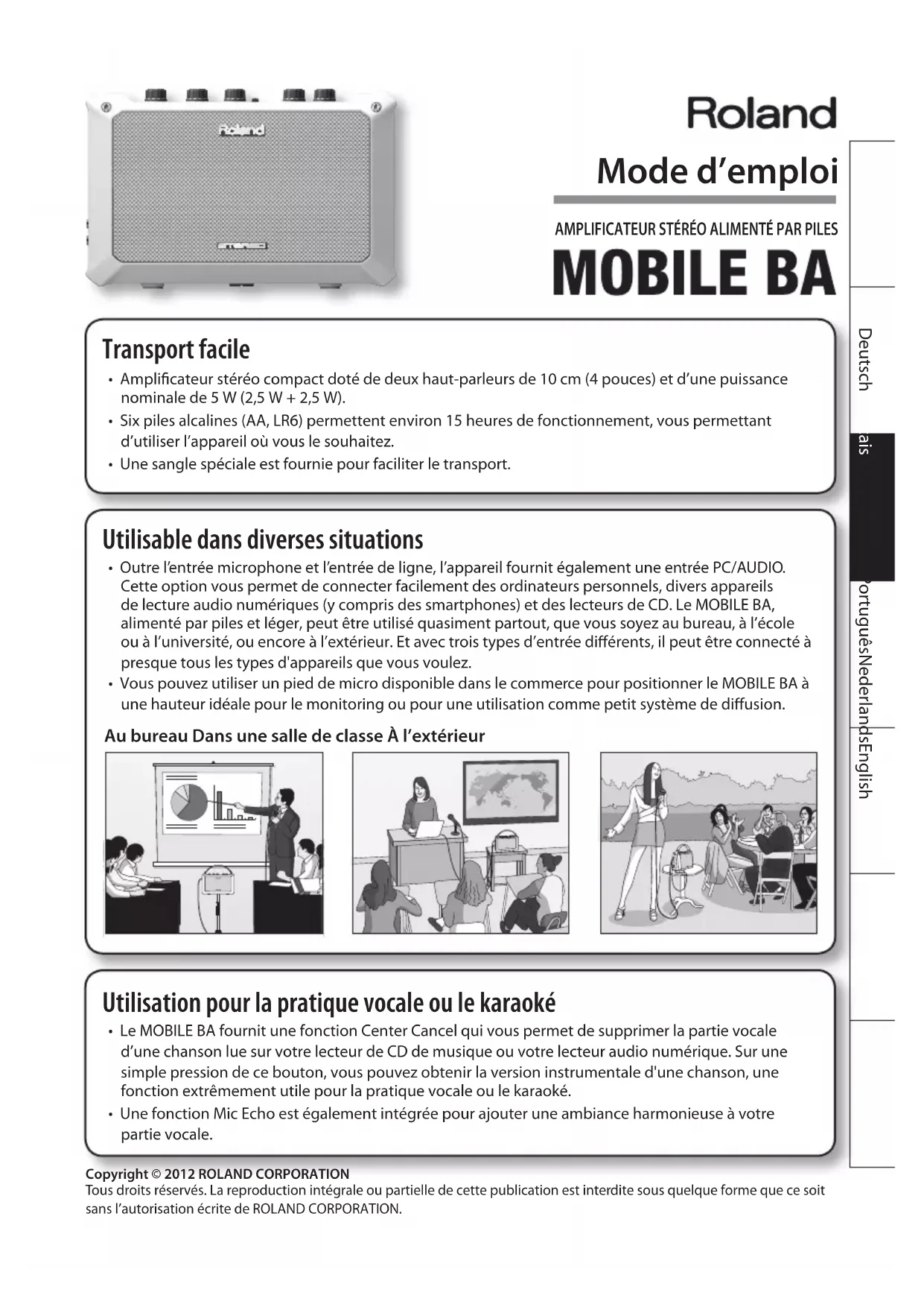 - Une sangle spéciale est fournie pour faciliter le transport. Copyright © 2012 ROLAND CORPORATION Tous droits réservés. La reproduction intégrale ou partielle de cette publication est interdite sous quelque forme que ce soit sans l’autorisation écrite de ROLAND CORPORATION. Utilisable dans diverses situations