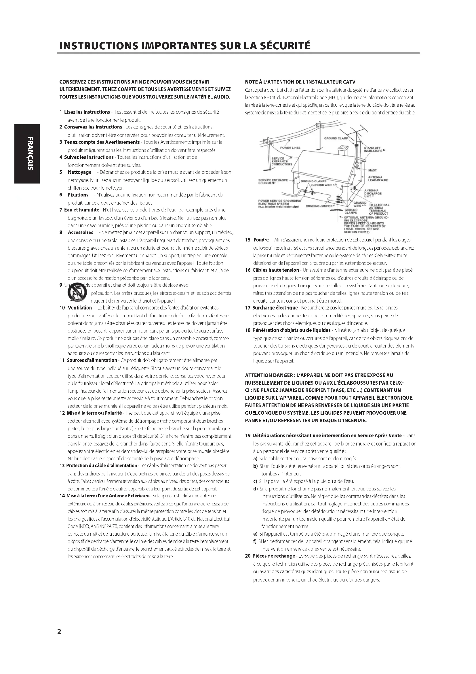 Manuel d’InstallationCONSERVEZ CES INSTRUCTIONS AFIN DE POUVOIR VOUS EN SERVIR ULTÉRIEUREMENT. TENEZ COMPTE DE TOUS LES AVERTISSEMENTS ET SUIVEZ TOUTES LES INSTRUCTIONS QUE VOUS TROUVEREZ SUR LE MATÉRIEL AUDIO. 1 Lisez les instructions - Il est essentiel de lire toutes les consignes de sécurité avant de faire fonctionner le produit. 2 Conservez les instructions - Les consignes de sécurité et les instructions d’utilisation doivent être conservées pour pouvoir les consulter ultérieurement. 3 Tenez compte des Avertissements - Tous les Avertissements imprimés sur le produit et gurant dans les instructions d’utilisation doivent être respectés. 4 Suivez les instructions - Toutes les instructions d’utilisation et de fonctionnement doivent être suivies. 5 Nettoyage - Débranchez ce produit de la prise murale avant de procéder à son nettoyage. N’utilisez aucun nettoyant liquide ou aérosol. Utilisez uniquement un chion sec pour le nettoyer. 6 Fixations - N’utilisez aucune xation non recommandée par le fabricant du produit, car cela peut entraîner des risques. 7 Eau et humidité - N’utilisez pas ce produit près de l’eau, par exemple près d’une baignoire, d’un lavabo, d’un évier ou d’un bac à lessive. Ne l’utilisez pas non plus dans une cave humide, près d’une piscine ou dans un endroit semblable. 8 Accessoires - Ne mettez jamais cet appareil sur un chariot, un support, un trépied, une console ou une table instables. L’appareil risquerait de tomber, provoquant des blessures graves chez un enfant ou un adulte et pourrait lui-même subir de sérieux dommages. Utilisez exclusivement un chariot, un support, un trépied, une console ou une table préconisés par le fabricant ou vendus avec l’appareil. Toute xation du produit doit être réalisée conformément aux instructions du fabricant, et à l’aide d’un accessoire de xation préconisé par le fabricant. 9 Un ensemble appareil et chariot doit toujours être déplacé avec précaution. Les arrêts brusques, les eorts excessifs et les sols accidentés risquent de renverser le chariot et l’appareil. 10 Ventilation - Le boîtier de l’appareil comporte des fentes d’aération évitant au produit de surchauer et lui permettant de fonctionner de façon able. Ces fentes ne doivent donc jamais être obstruées ou recouvertes. Les fentes ne doivent jamais être obstruées en posant l’appareil sur un lit, un canapé, un tapis ou toute autre surface molle similaire. Ce produit ne doit pas être placé dans un ensemble encastré, comme par exemple une bibliothèque vitrée ou un rack, à moins de prévoir une ventilation adéquate ou de respecter les instructions du fabricant. 11 Sources d’alimentation - Ce produit doit obligatoirement être alimenté par une source du type indiqué sur l’étiquette. Si vous avez un doute concernant le type d’alimentation secteur utilisé dans votre domicile, consultez votre revendeur ou le fournisseur local d’électricité. La principale méthode à utiliser pour isoler l’amplicateur de l’alimentation secteur est de débrancher la prise secteur. Assurez- vous que la prise secteur reste accessible à tout moment. Débranchez le cordon secteur de la prise murale si l’appareil ne va pas être utilisé pendant plusieurs mois. 12 Mise à la terre ou Polarité - Il se peut que cet appareil soit équipé d’une prise secteur alternatif avec système de détrompage (che comportant deux broches plates, l’une plus large que l’autre). Cette che ne se branche sur la prise murale que dans un sens. Il s’agit d’un dispositif de sécurité. Si la che n’entre pas complètement dans la prise, essayez de la brancher dans l’autre sens. Si elle n’entre toujours pas, appelez votre électricien et demandez-lui de remplacer votre prise murale obsolète. Ne bricolez pas le dispositif de sécurité de la prise avec détrompage. 13 Protection du câble d’alimentation - Les câbles d’alimentation ne doivent pas passer dans des endroits où ils risquent d’être piétinés ou pincés par des articles posés dessus ou à côté. Faites particulièrement attention aux câbles au niveau des prises, des connecteurs de commodité à l’arrière d’autres appareils, et à leur point de sortie de cet appareil. 14 Mise à la terre d’une Antenne Extérieure - Si l’appareil est relié à une antenne extérieure ou à un réseau de câbles extérieurs, veillez à ce que l’antenne ou le réseau de câbles soit mis à la terre an d’assurer la même protection contre les pics de tension et les charges liées à l’accumulation d’électricité statique. L’Article 810 du National Electrical Code (NEC), ANSI/NFPA 70, contient des informations concernant la mise à la terre correcte du mât et de la structure porteuse, la mise à la terre du câble d’amenée sur un dispositif de décharge d’antenne, le calibre des câbles de mise à la terre, l’emplacement du dispositif de décharge d’antenne, le branchement aux électrodes de mise à la terre et les exigences concernant les électrodes de mise à la terre. NOTE À L’ATTENTION DE L’INSTALLATEUR CATV Ce rappel a pour but d’attirer l’attention de l’installateur du système d’antenne collective sur la Section 820 40 du National Electrical Code (NEC), qui donne des informations concernant la mise à la terre correcte et qui spécie, en particulier, que la terre du câble doit être reliée au système de mise à la terre du bâtiment et ce le plus près possible du point d’entrée du câble. 15 Foudre - An d’assurer une meilleure protection de cet appareil pendant les orages, ou lorsqu’il reste inutilisé et sans surveillance pendant de longues périodes, débranchez la prise murale et déconnectez l’antenne ou le système de câbles. Cela évitera toute détérioration de l’appareil par la foudre ou par les surtensions de secteur. 16 Câbles haute tension - Un système d’antenne ext