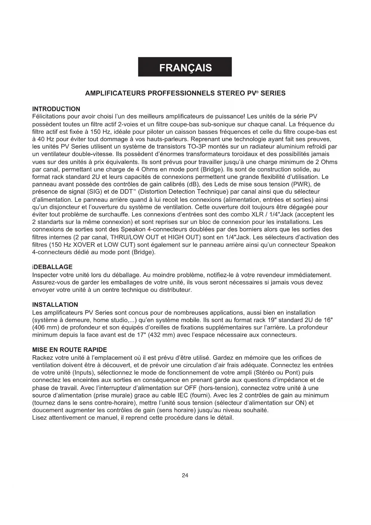 (Distortion Detection Technique) par canal ainsi que du sélecteur d’alimentation. Le panneau arrière quand à lui recoit les connexions (alimentation, entrées et sorties) ainsi qu’un disjoncteur et l’ouverture du système de ventilation. Cette ouverture doit toujours être dégagée pour éviter tout problème de surchauffe. Les connexions d’entrées sont des combo XLR / 1/4"Jack (acceptent les 2 standarts sur la même connexion) et sont reprises sur un bloc de connexion pour les installations. Les connexions de sorties sont des Speakon 4-connecteurs doublées par des borniers alors que les sorties des filtres internes (2 par canal, THRU/LOW OUT et HIGH OUT) sont en 1/4"Jack. Les sélecteurs d’activation des filtres (150 Hz XOVER et LOW CUT) sont également sur le panneau arrière ainsi qu’un connecteur Speakon 4-connecteurs dédié au mode pont (Bridge). iDEBALLAGE Inspecter votre unité lors du déballage. Au moindre problème, notifiez-le à votre revendeur immédiatement. Assurez-vous de garder les emballages de votre unité, ils vous seront nécessaires si jamais vous devez envoyer votre unité à un centre technique ou distributeur. INSTALLATION Les amplificateurs PV Series sont concus pour de nombreuses applications, aussi bien en installation (système à demeure, home studio,...) qu’en système mobile. Ils sont au format rack 19" standard 2U de 16" (406 mm) de profondeur et son équipés d’oreilles de fixations supplémentaires sur l’arrière. La profondeur minimum depuis la face avant est de 17" (432 mm) avec l’espace nécessaire aux connecteurs.