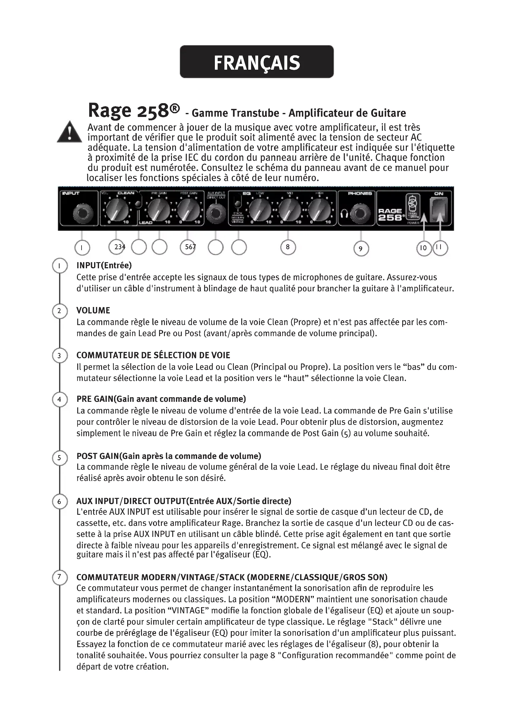 - Gamme Transtube - Amplificateur de Guitare Avant de commencer à jouer de la musique avec votre amplificateur, il est très important de vérifier que le produit soit alimenté avec la tension de secteur AC adéquate. La tension d'alimentation de votre amplificateur est indiquée sur l'étiquette à proximité de la prise IEC du cordon du panneau arrière de l'unité. Chaque fonction du produit est numérotée. Consultez le schéma du panneau avant de ce manuel pour localiser les fonctions spéciales à côté de leur numéro. INPUT(Entrée) Cette prise d'entrée accepte les signaux de tous types de microphones de guitare. Assurez-vous d'utiliser un câble d'instrument à blindage de haut qualité pour brancher la guitare à l'amplificateur. VOLUME La commande règle le niveau de volume de la voie Clean (Propre) et n'est pas affectée par les com- mandes de gain Lead Pre ou Post (avant/après commande de volume principal).
