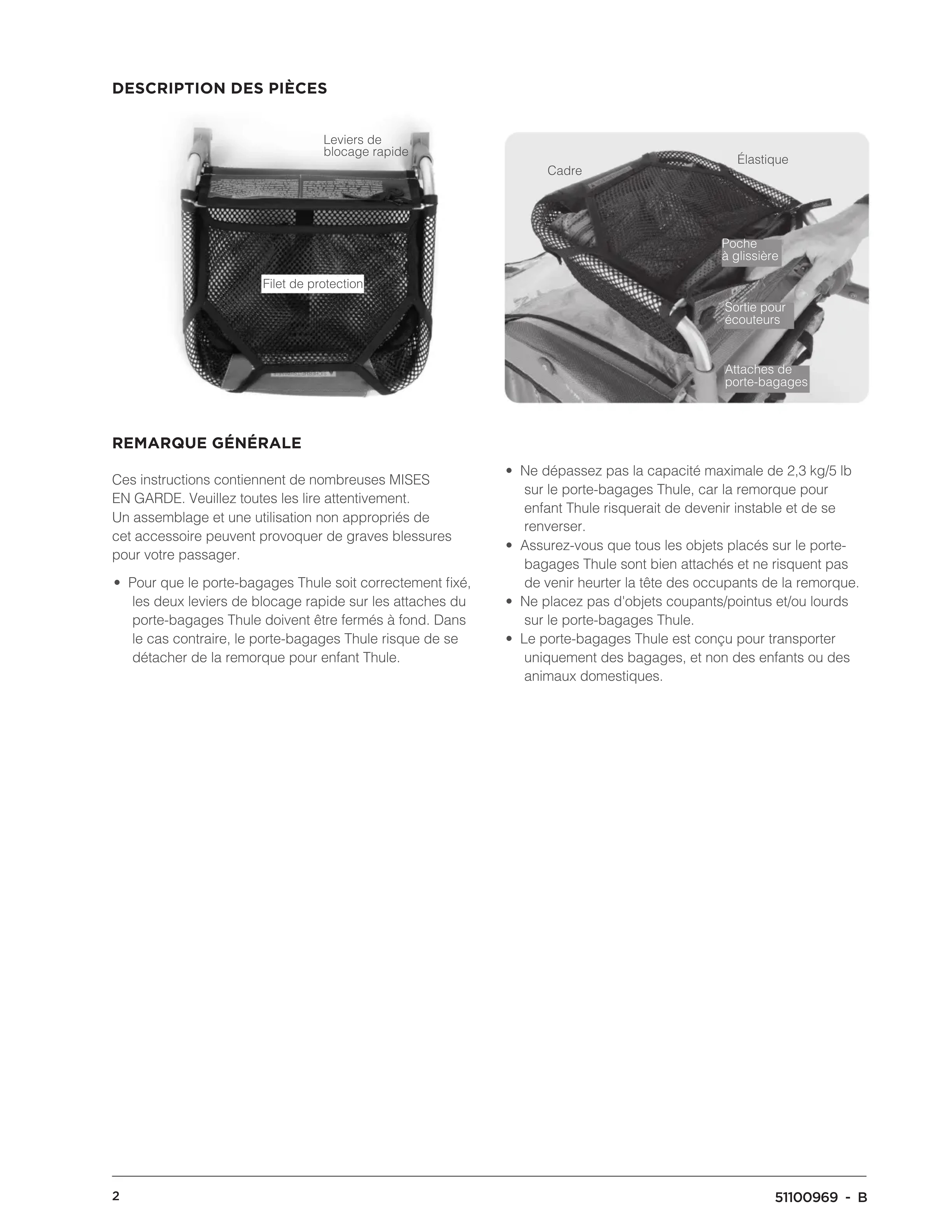 Ces instructions contiennent de nombreuses MISES EN GARDE. Veuillez toutes les dire attentivement. Un assemblage et une utilisation non appropriés de cet accessoire peuvent provoquer de graves blessures pour votre passager.