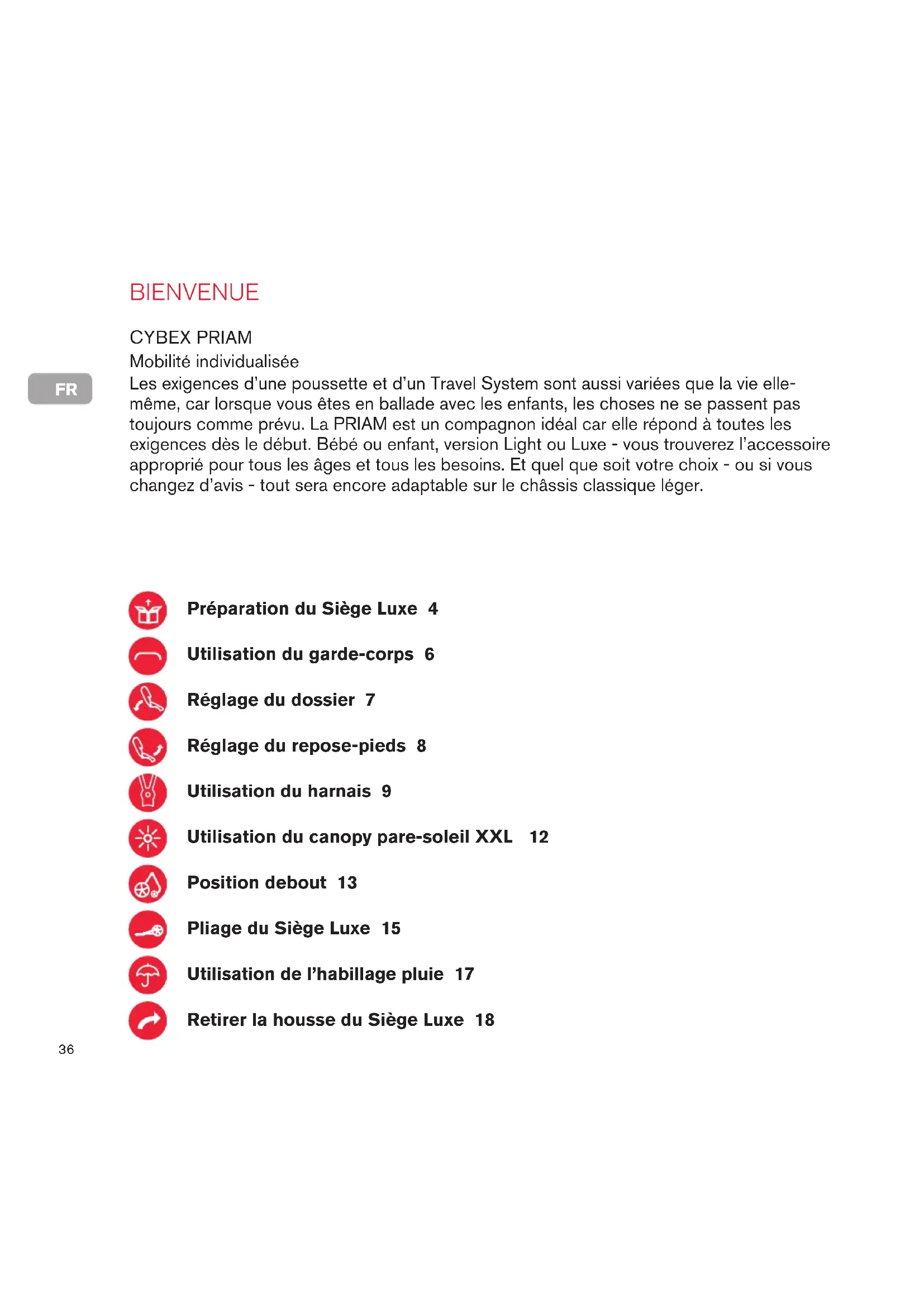 BIENVENUE Les exigences d’une poussette et d’un Travel System sont aussi variées que la vie elle- même, car lorsque vous êtes en ballade avec les enfants, les choses ne se passent pas toujours comme prévu. La PRIAM est un compagnon idéal car elle répond à toutes les exigences dès le début. Bébé ou enfant, version Light ou Luxe - vous trouverez l’accessoire approprié pour tous les âges et tous les besoins. Et quel que soit votre choix - ou si vous changez d’avis - tout sera encore adaptable sur le châssis classique léger. Mobilité individualisée CYBEX PRIAM Préparation du Siège Luxe 4 Utilisation du garde-corps 6 Réglage du dossier 7 Réglage du repose-pieds 8 Utilisation du harnais 9 Utilisation du canopy pare-soleil XXL 12 Position debout 13 Pliage du Siège Luxe 15 Utilisation de l’habillage pluie 17 Retirer la housse du Siège Luxe 18FR