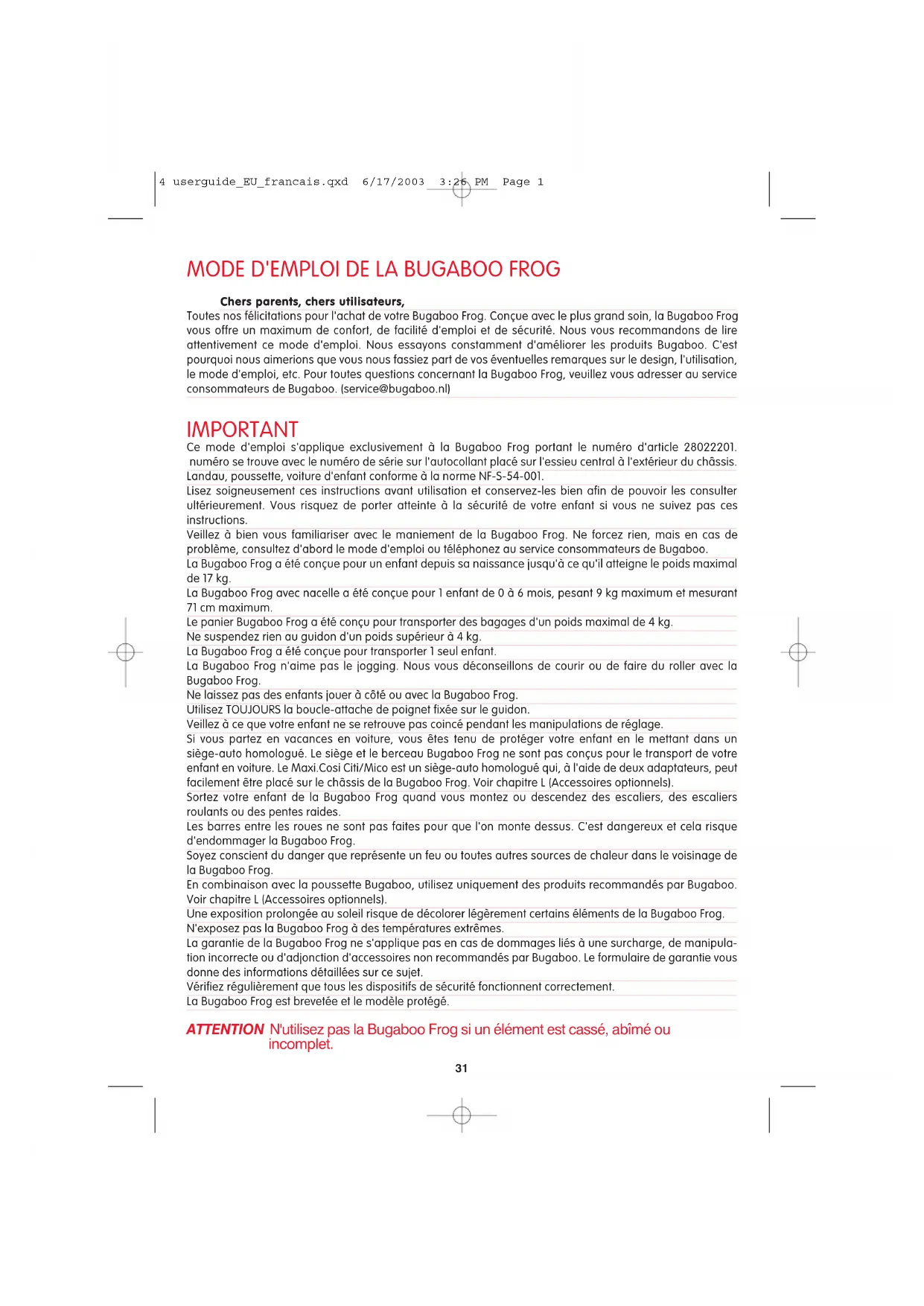 3 userguide_EU_deutsch.qxd 6/17/2003 3:24 PM Page 11MODE D'EMPLOI DE LA BUGABOO FROG Chers parents, chers utilisateurs, Toutes nos félicitations pour l'achat de votre Bugaboo Frog. Conçue avec le plus grand soin, la Bugaboo Frog vous offre un maximum de confort, de facilité d'emploi et de sécurité. Nous vous recommandons de lire attentivement ce mode d'emploi. Nous essayons constamment d'améliorer les produits Bugaboo. C'est pourquoi nous aimerions que vous nous fassiez part de vos éventuelles remarques sur le design, l'utilisation, le mode d'emploi, etc. Pour toutes questions concernant la Bugaboo Frog, veuillez vous adresser au service consommateurs de Bugaboo. (service@bugaboo.nl) IMPORTANT Ce mode d'emploi s'applique exclusivement à la Bugaboo Frog portant le numéro d'article 28022201. numéro se trouve avec le numéro de série sur l'autocollant placé sur l'essieu central à l'extérieur du châssis. Landau, poussette, voiture d'enfant conforme à la norme NF-S-54-001. Lisez soigneusement ces instructions avant utilisation et conservez-les bien afin de pouvoir les consulter ultérieurement. Vous risquez de porter atteinte à la sécurité de votre enfant si vous ne suivez pas ces instructions. Veillez à bien vous familiariser avec le maniement de la Bugaboo Frog. Ne forcez rien, mais en cas de problème, consultez d'abord le mode d'emploi ou téléphonez au service consommateurs de Bugaboo. La Bugaboo Frog a été conçue pour un enfant depuis sa naissance jusqu'à ce qu'il atteigne le poids maximal de 17 kg. La Bugaboo Frog avec nacelle a été conçue pour 1 enfant de 0 à 6 mois, pesant 9 kg maximum et mesurant 71 cm maximum. Le panier Bugaboo Frog a été conçu pour transporter des bagages d'un poids maximal de 4 kg. Ne suspendez rien au guidon d'un poids supérieur à 4 kg. La Bugaboo Frog a été conçue pour transporter 1 seul enfant. La Bugaboo Frog n'aime pas le jogging. Nous vous déconseillons de courir ou de faire du roller avec la Bugaboo Frog. Ne laissez pas des enfants jouer à côté ou avec la Bugaboo Frog. Utilisez TOUJOURS la boucle-attache de poignet fixée sur le guidon. Veillez à ce que votre enfant ne se retrouve pas coincé pendant les manipulations de réglage. Si vous partez en vacances en voiture, vous êtes tenu de protéger votre enfant en le mettant dans un siège-auto homologué. Le siège et le berceau Bugaboo Frog ne sont pas conçus pour le transport de votre enfant en voiture. Le Maxi.Cosi Citi/Mico est un siège-auto homologué qui, à l'aide de deux adaptateurs, peut facilement être placé sur le châssis de la Bugaboo Frog. Voir chapitre L (Accessoires optionnels). Sortez votre enfant de la Bugaboo Frog quand vous montez ou descendez des escaliers, des escaliers roulants ou des pentes raides. Les barres entre les roues ne sont pas faites pour que l'on monte dessus. C'est dangereux et cela risque d'endommager la Bugaboo Frog. Soyez conscient du danger que représente un feu ou toutes autres sources de chaleur dans le voisinage de la Bugaboo Frog. En combinaison avec la poussette Bugaboo, utilisez uniquement des produits recommandés par Bugaboo. Voir chapitre L (Accessoires optionnels). Une exposition prolongée au soleil risque de décolorer légèrement certains éléments de la Bugaboo Frog. N'exposez pas la Bugaboo Frog à des températures extrêmes. La garantie de la Bugaboo Frog ne s'applique pas en cas de dommages liés à une surcharge, de manipula- tion incorrecte ou d'adjonction d'accessoires non recommandés par Bugaboo. Le formulaire de garantie vous donne des informations détaillées sur ce sujet. Vérifiez régulièrement que tous les dispositifs de sécurité fonctionnent correctement. La Bugaboo Frog est brevetée et le modèle protégé. A TTENTION N'utilisez pas la Bugaboo Frog si un élément est cassé, abîmé ou incomplet.