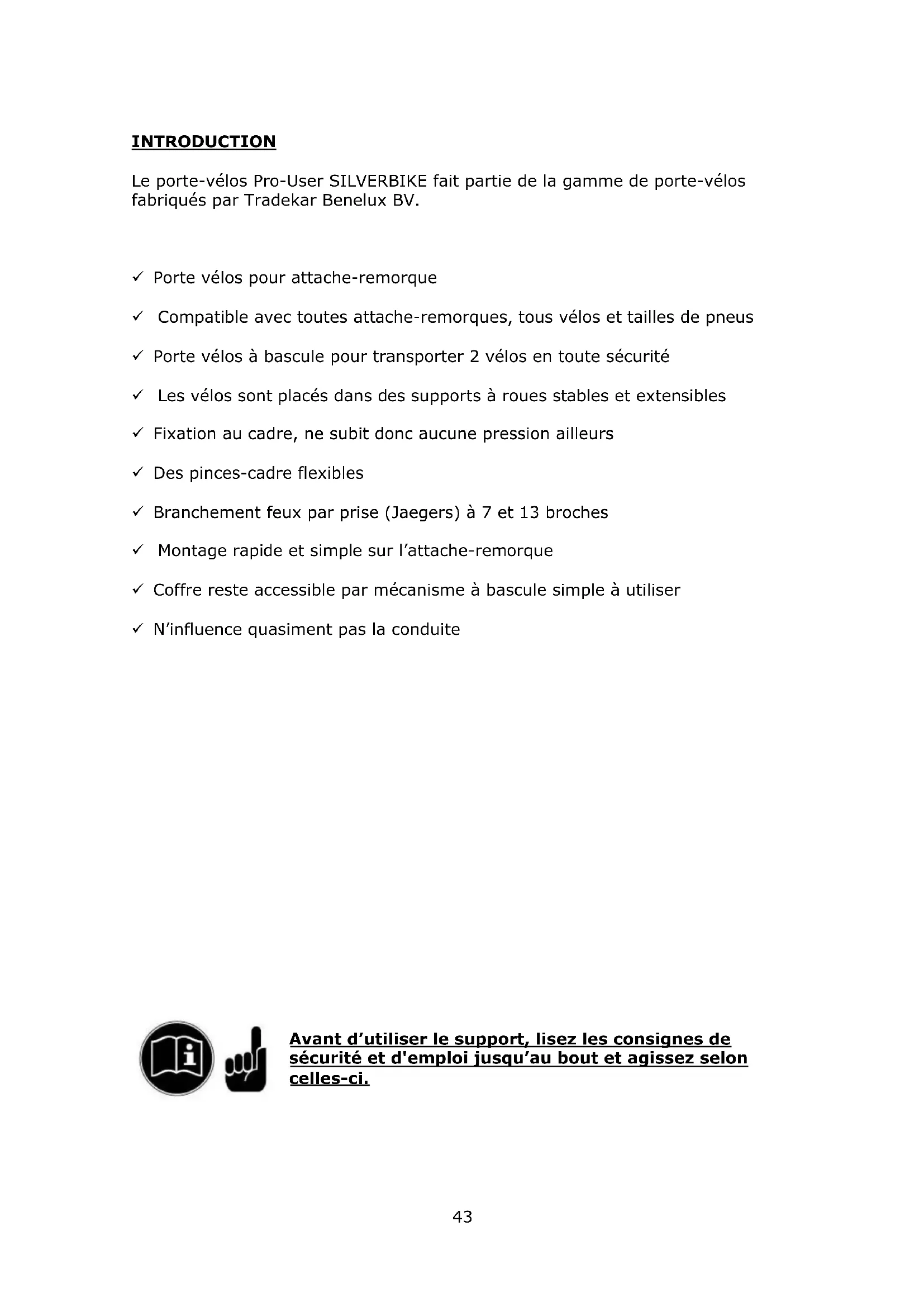Les étapes reprises et les instructions en matière de sécurité pour le montage, le maniement et l'utilisation du porte-velos doivent être rigoureusement suivies. La moindre divergence peut mener à un mauvais montage ou à une utilisation erronée.