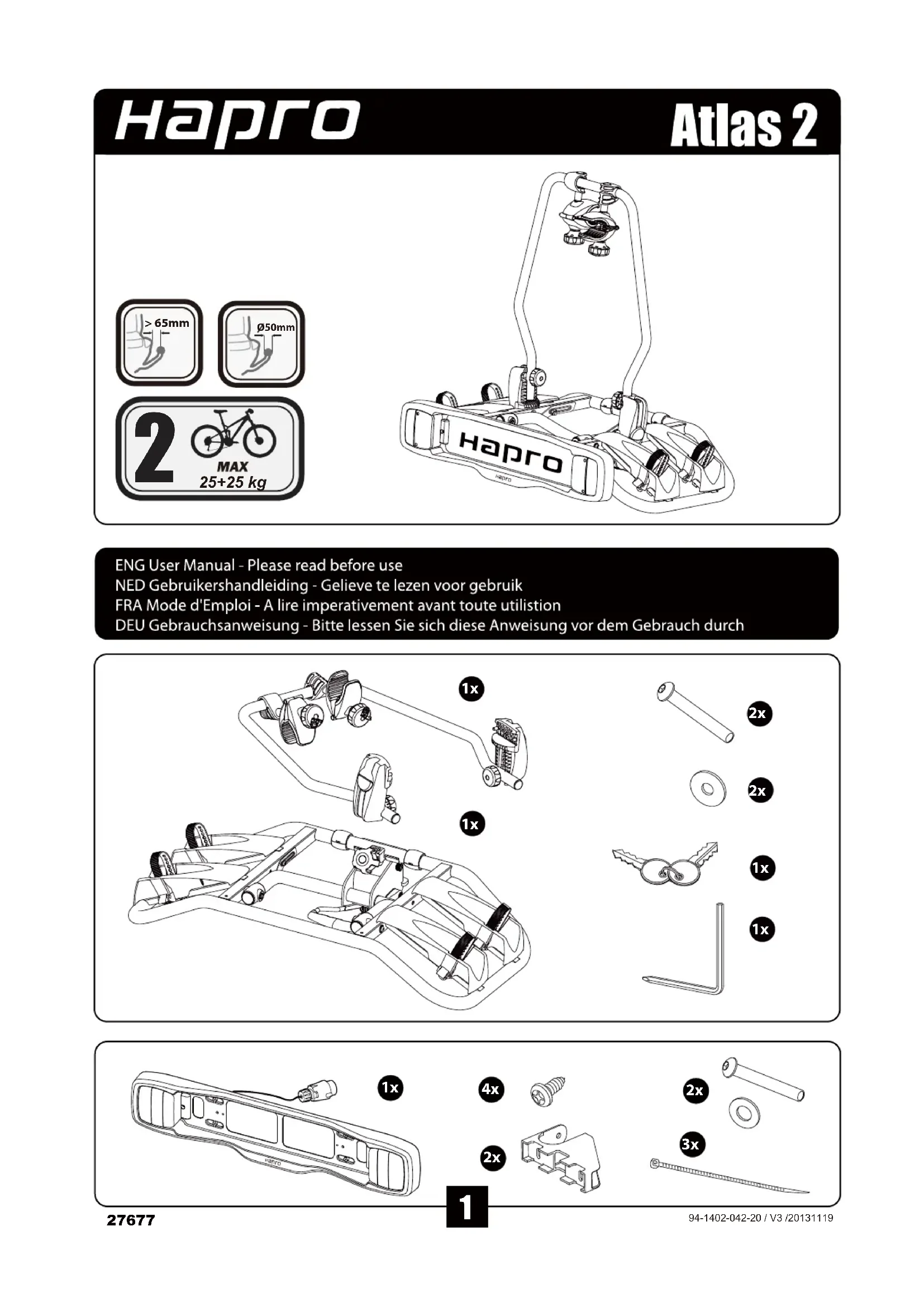 FRA-INFORMATION & AVERTISSEMENTS ! DEU-INFORMATION & WARNHINWEISE ! Lire attentivement les instructions. S'assurer que le porte-vélos est assemblé selon les instructions avant de le monter sur le véhicule. Dépendamment de la géométrie de vos vélos, Hapro ne peut garantir qu'ils peuvent se monter facilement sur ce porte-vélos. 1. Ce produit est conçu pour être monté sur une boule d'attelage ISO de 50mm. Toujours vérifier la limitation de poids sur l'attelage et ne jamais la dépasser. 2. Ne pas transporter plus de vélos que la quantité recommandée. Les poids maximum sont de 25 kg pour le vélo en position 1, 25 kg pour le vélo en position 2, et maximum de 15 kg pour le vélo en position 3 (Hapro Atlas 3). 3. L'utilisateur a la responsabilité de vérifier périodiquement que tous les éléments de serrage ou de montage sont bien serrés pour une sécurité optimale.