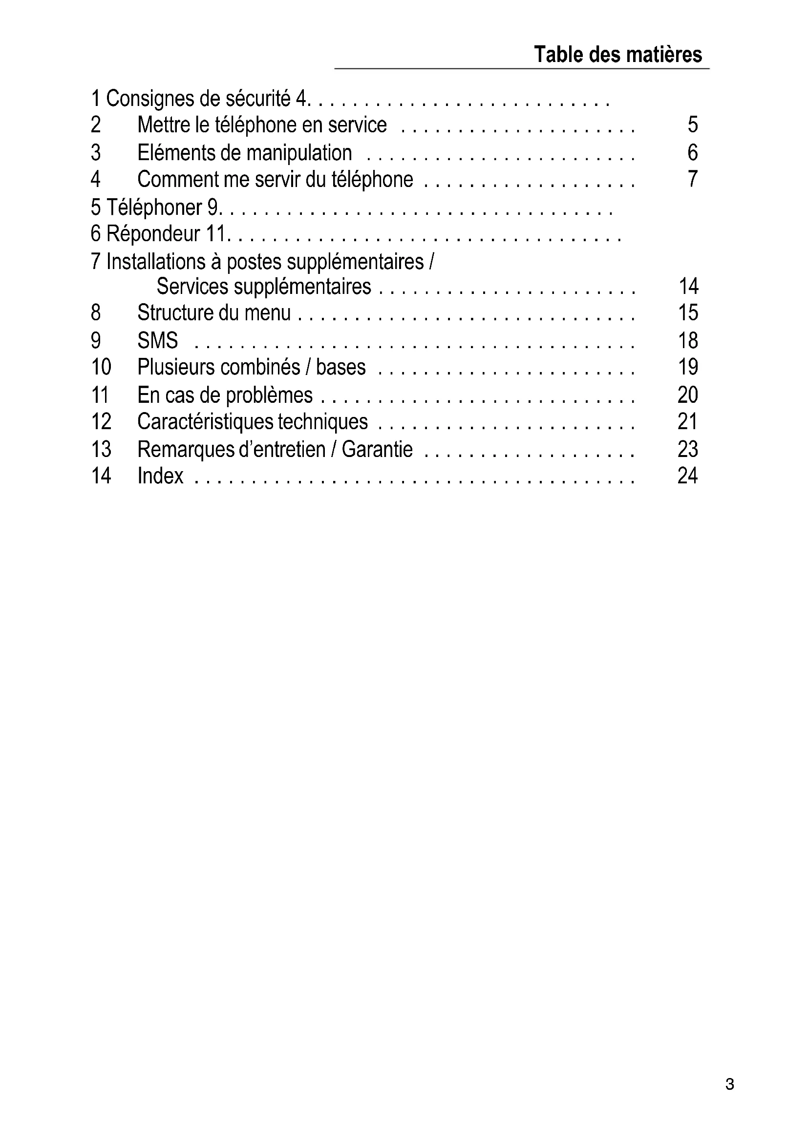 1 Consignes de sécurité 4. . . . . . . . . . . . . . . . . . . . . . . . . . . 2 Mettre le téléphone en service 5. . . . . . . . . . . . . . . . . . . . . 3 Eléments de manipulation 6. . . . . . . . . . . . . . . . . . . . . . . . 4 Comment me servir du téléphone 7. . . . . . . . . . . . . . . . . . . 5 Téléphoner 9. . . . . . . . . . . . . . . . . . . . . . . . . . . . . . . . . . . 6 Répondeur 11. . . . . . . . . . . . . . . . . . . . . . . . . . . . . . . . . . . 7 Installations à postes supplémentaires / Services supplémentaires 14. . . . . . . . . . . . . . . . . . . . . . . 8 Structure du menu 15. . . . . . . . . . . . . . . . . . . . . . . . . . . . . . 9 SMS 18. . . . . . . . . . . . . . . . . . . . . . . . . . . . . . . . . . . . . . . 10 Plusieurs combinés / bases 19. . . . . . . . . . . . . . . . . . . . . . . 11 En cas de problèmes 20. . . . . . . . . . . . . . . . . . . . . . . . . . . . 12 Caractéristiques techniques 21. . . . . . . . . . . . . . . . . . . . . . . 13 Remarques d’entretien / Garantie 23. . . . . . . . . . . . . . . . . . . 14 Index 24. . . . . . . . . . . . . . . . . . . . . . . . . . . . . . . . . . . . . . .Consignes de sécurité
