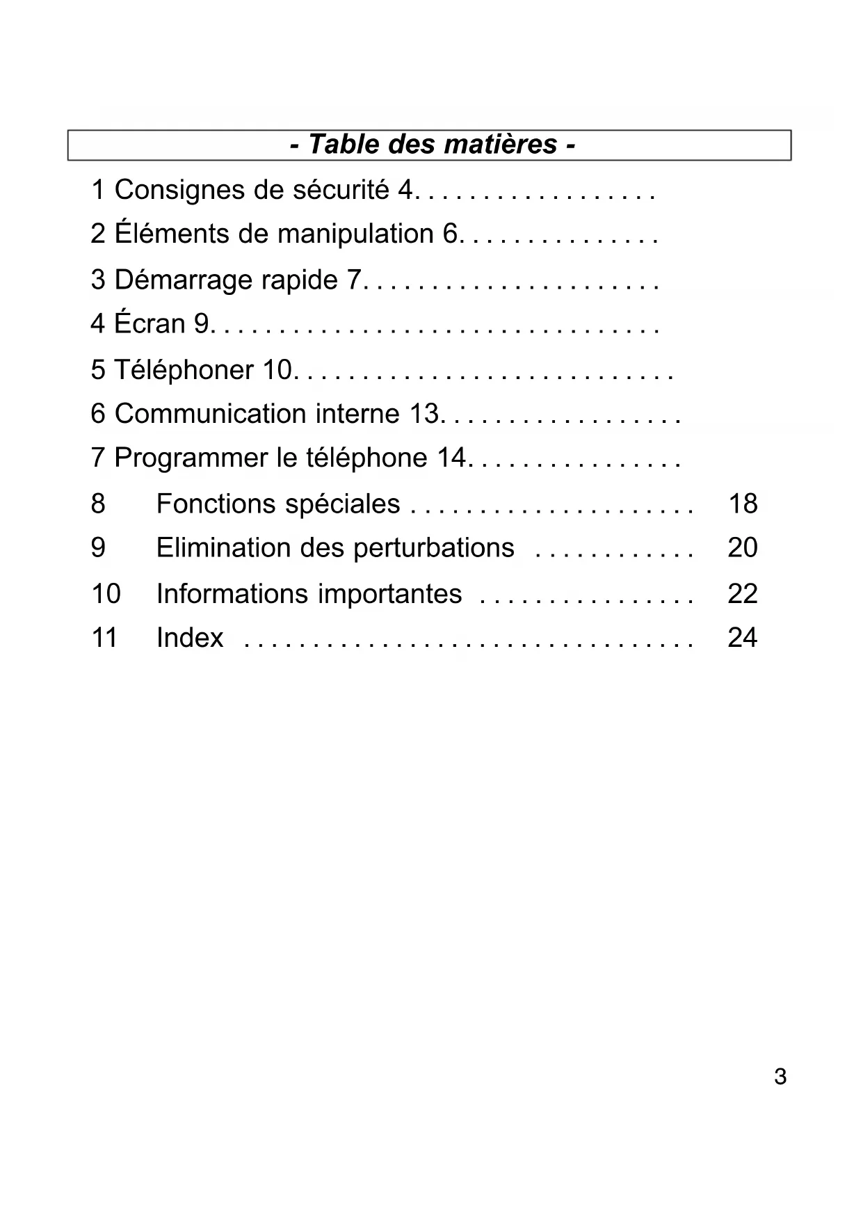 1 Consignes de sécurité 4. . . . . . . . . . . . . . . . . . 2 Éléments de manipulation 6. . . . . . . . . . . . . . . 3 Démarrage rapide 7. . . . . . . . . . . . . . . . . . . . . . 4 Écran 9. . . . . . . . . . . . . . . . . . . . . . . . . . . . . . . . . 5 Téléphoner 10. . . . . . . . . . . . . . . . . . . . . . . . . . . . 6 Communication interne 13. . . . . . . . . . . . . . . . . . 7 Programmer le téléphone 14. . . . . . . . . . . . . . . . 8 Fonctions spéciales 18. . . . . . . . . . . . . . . . . . . . . 9 Elimination des perturbations 20. . . . . . . . . . . . 10 Informations importantes 22. . . . . . . . . . . . . . . . 11 Index 24. . . . . . . . . . . . . . . . . . . . . . . . . . . . . . . . .− Consignes de sécurité −
