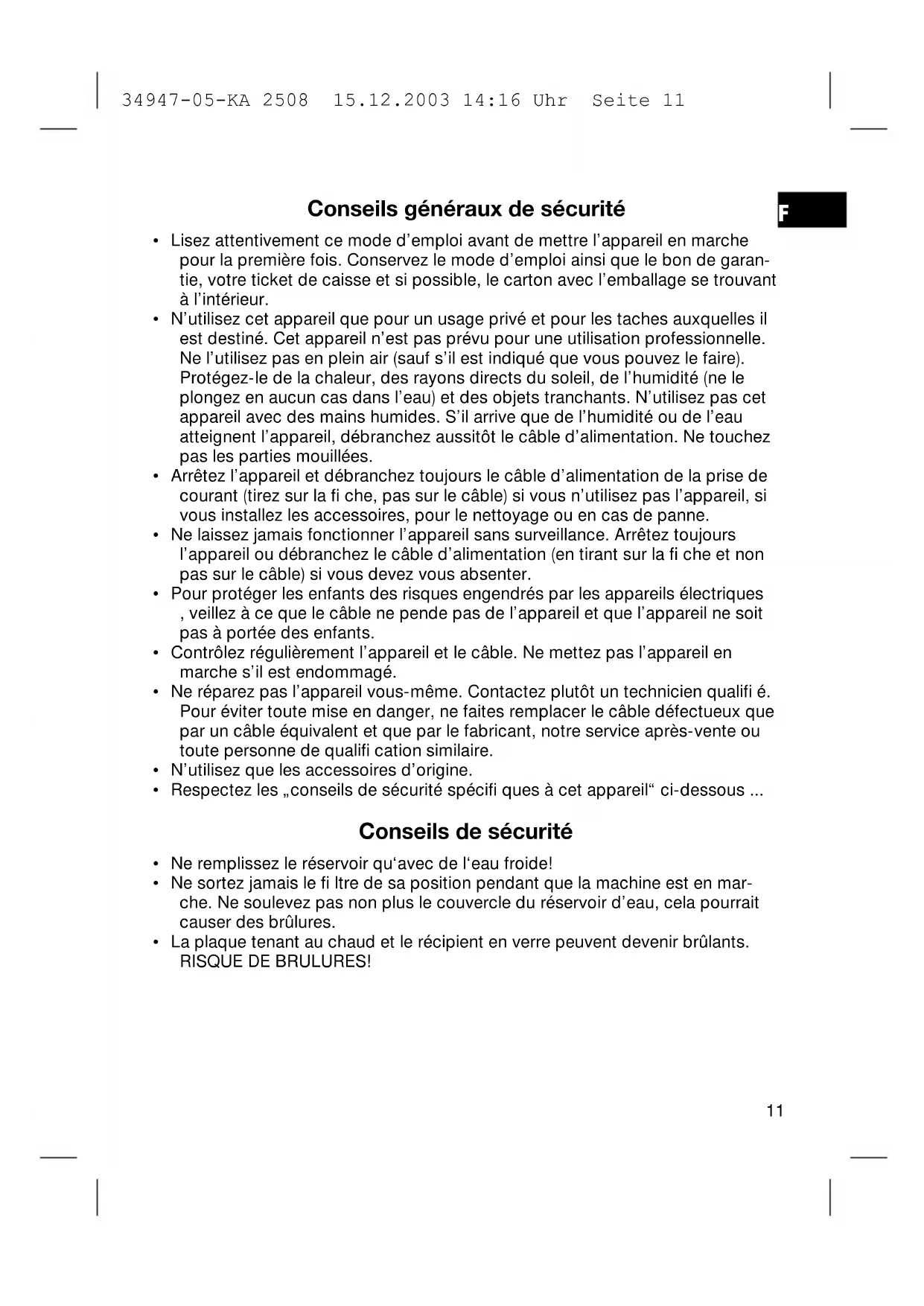 - La plaque tenant au chaud et le récipient en verre peuvent devenir brûlants. RISQUE DE BRULURES! 34947-05-KA 2508 15.12.2003 14:16 Uhr Seite 11Avant la première utilisation