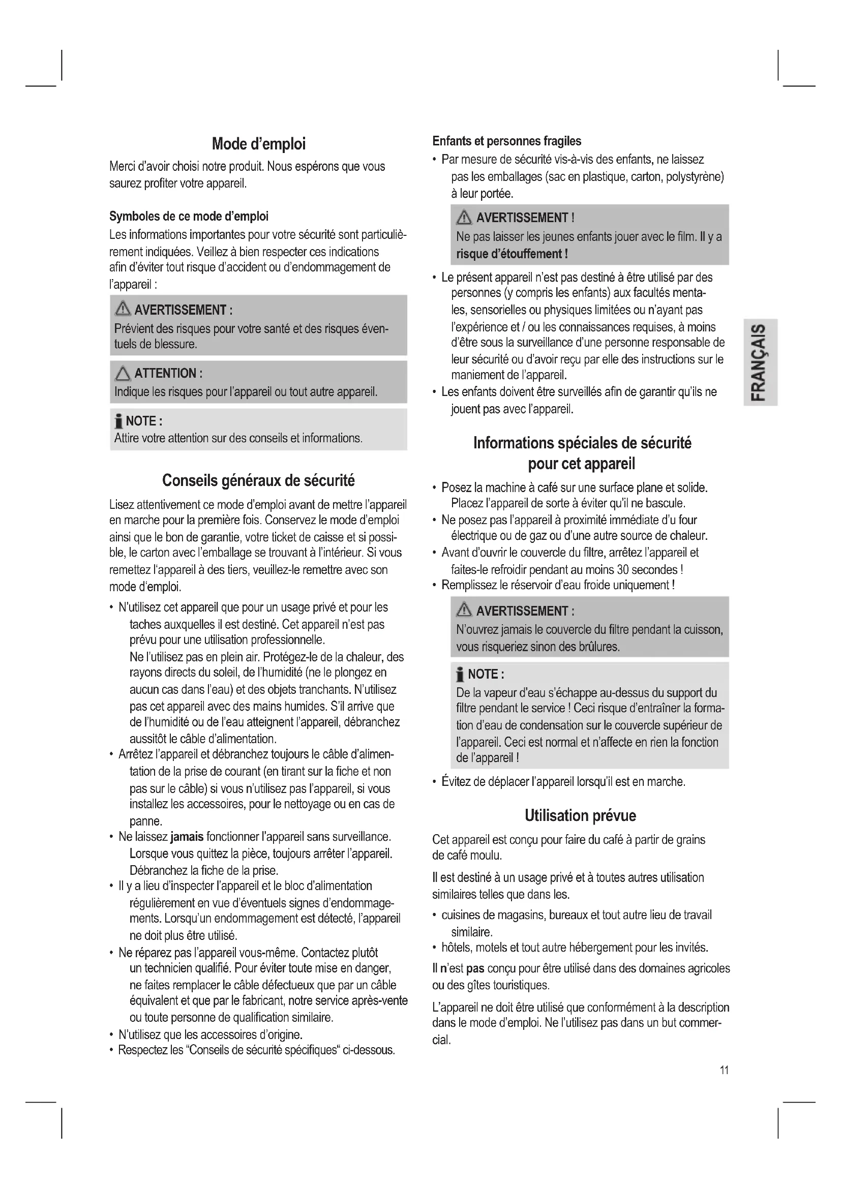 - Évitez de déplacer l’appareil lorsqu’il est en marche. Utilisation prévue Cet appareil est conçu pour faire du café à partir de grains de café moulu. Il est destiné à un usage privé et à toutes autres utilisation similaires telles que dans les.