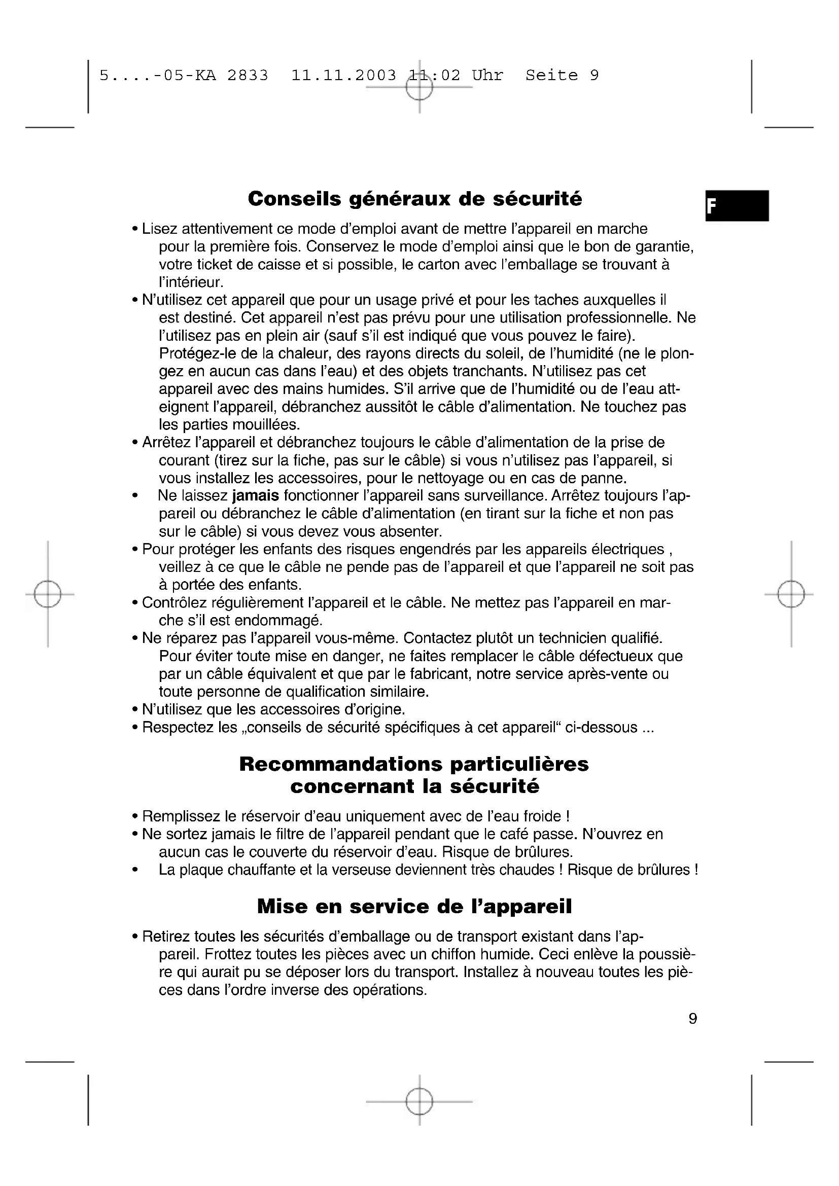5....-05-KA 2833 11.11.2003 11:02 Uhr Seite 9• Avant de faire votre premier café, veuillez faire passer 2 ou 3 fois de l’eau froide pour nettoyer l’appareil. Alimentation électrique