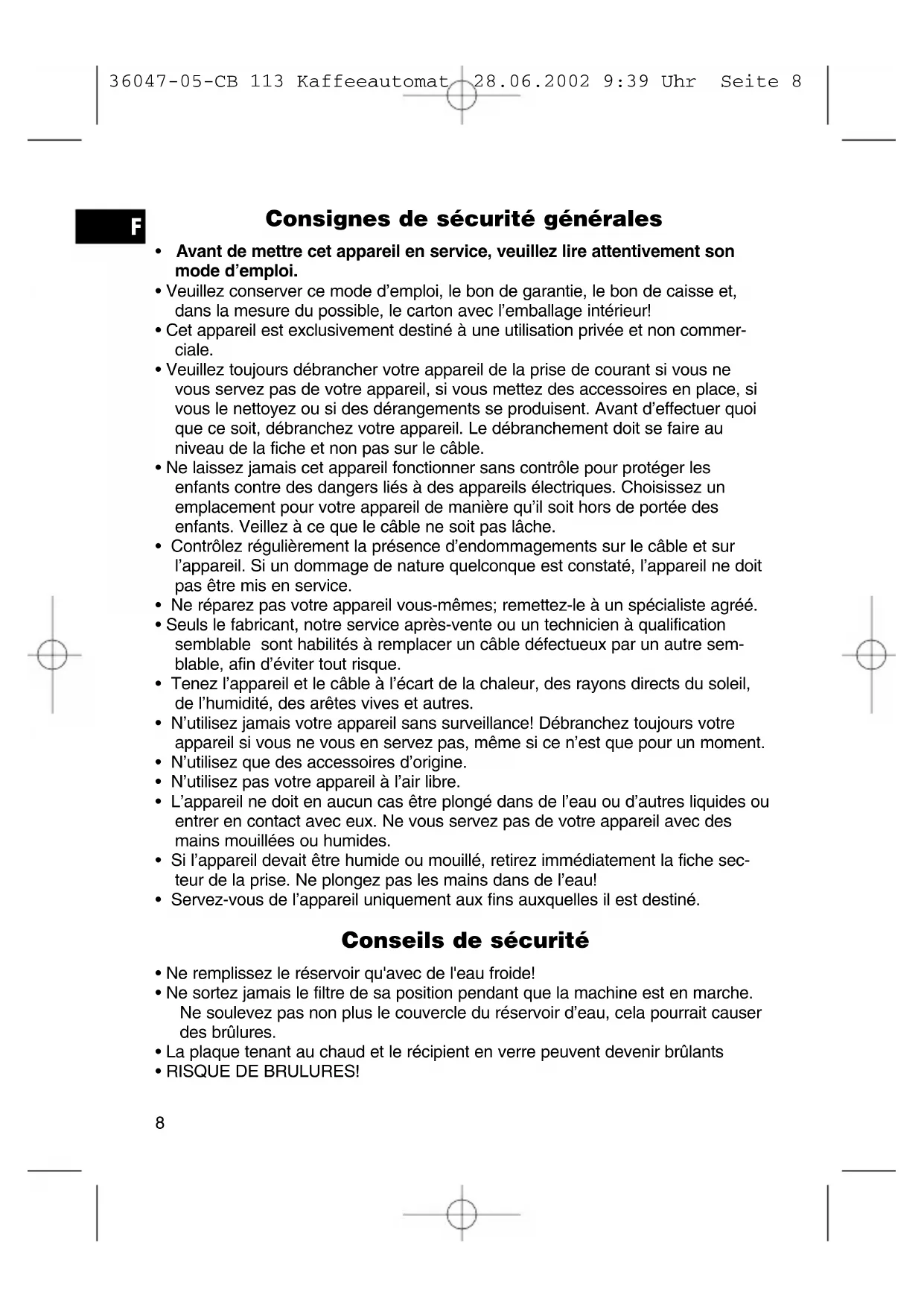 36047-05-CB 113 Kaffeeautomat 28.06.2002 9:39 Uhr Seite 9Garantie Nous fournissons une garantie de 24 mois à partir de la date d’achat (ticket de caisse) pour tous les appareils de notre marque. Nous assurons les réparations ou le remplacement des appareils pour toutes les pannes et tous les défauts de matériau ou de fabrication, apparus pendant la durée de la garantie. Le ticket de caisse est votre certificat de garantie. Sans cette preuve d’achat, aucun remplacement ni aucune réparation ne seront faits gratuitement. Si vous devez avoir recours à la garantie, rapportez tout votre appareil dans l’em- ballage original avec le ticket de caisse à votre vendeur. Les débris de verre et le mauvais fonctionnement des accessoires ne peuvent justi- fier le remplacement de tout l’appareil mais seront remplacés individuellement et gratuitement. Il n’est donc pas nécessaire, dans ce cas, de renvoyer tout l’appareil. Il vous suffit de commander les accessoires défectueux ! Le nettoyage, la maintenance et le remplacement des pièces résistantes à l’usure ne font pas partie de la garantie et ne sont donc pas proposés gratuitement. La garantie est annulée lorsque l’appareil est utilisée par une tierce personne. Après la garantie Après expiration de la garantie, les réparations peuvent être effectuées, moyennant paiement, par des commerces spécialisés ou des services de réparations qualifiés.