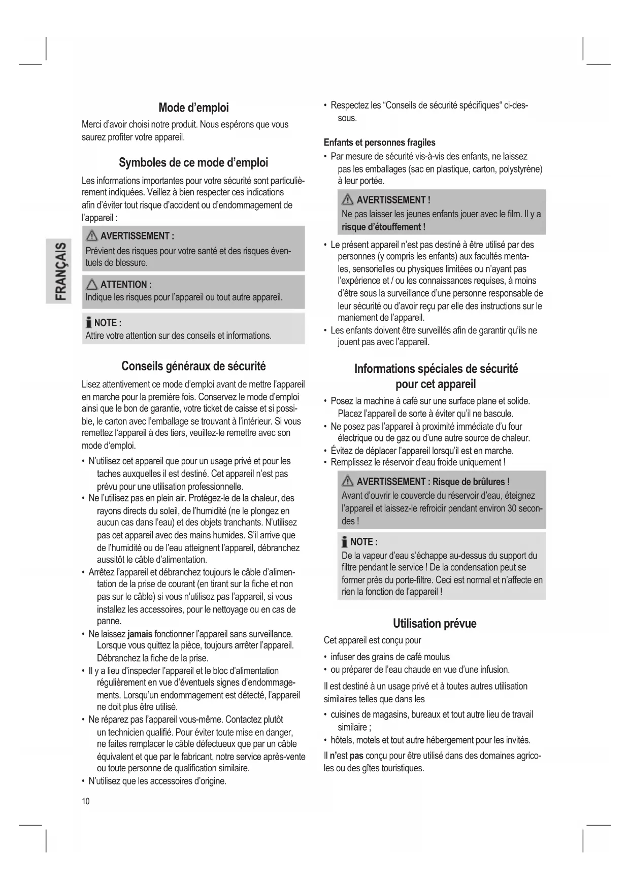 Avant d’ouvrir le couvercle du réservoir d’eau, éteignez l’appareil et laissez-le refroidir pendant environ 30 secon- des ! NOTE : De la vapeur d’eau s’échappe au-dessus du support du ltre pendant le service ! De la condensation peut se former près du porte-ltre. Ceci est normal et n’affecte en rien la fonction de l’appareil ! Utilisation prévue Cet appareil est conçu pour
