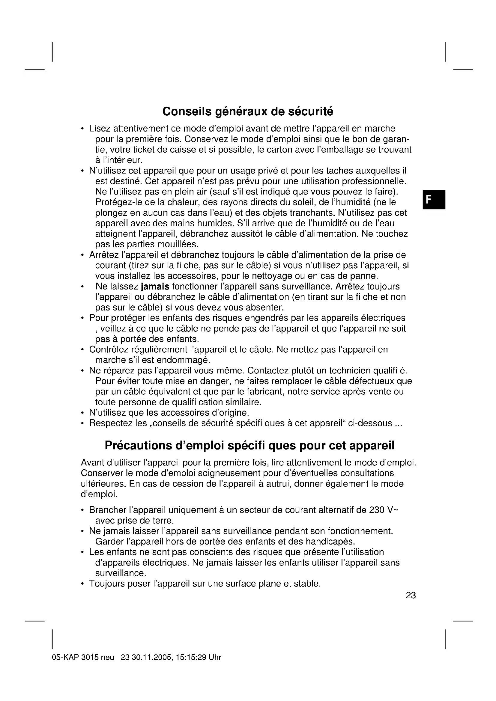 - Toujours poser l’appareil sur une surface plane et stable. 05-KAP 3015 neu 23 30.11.2005, 15:15:29 UhrF