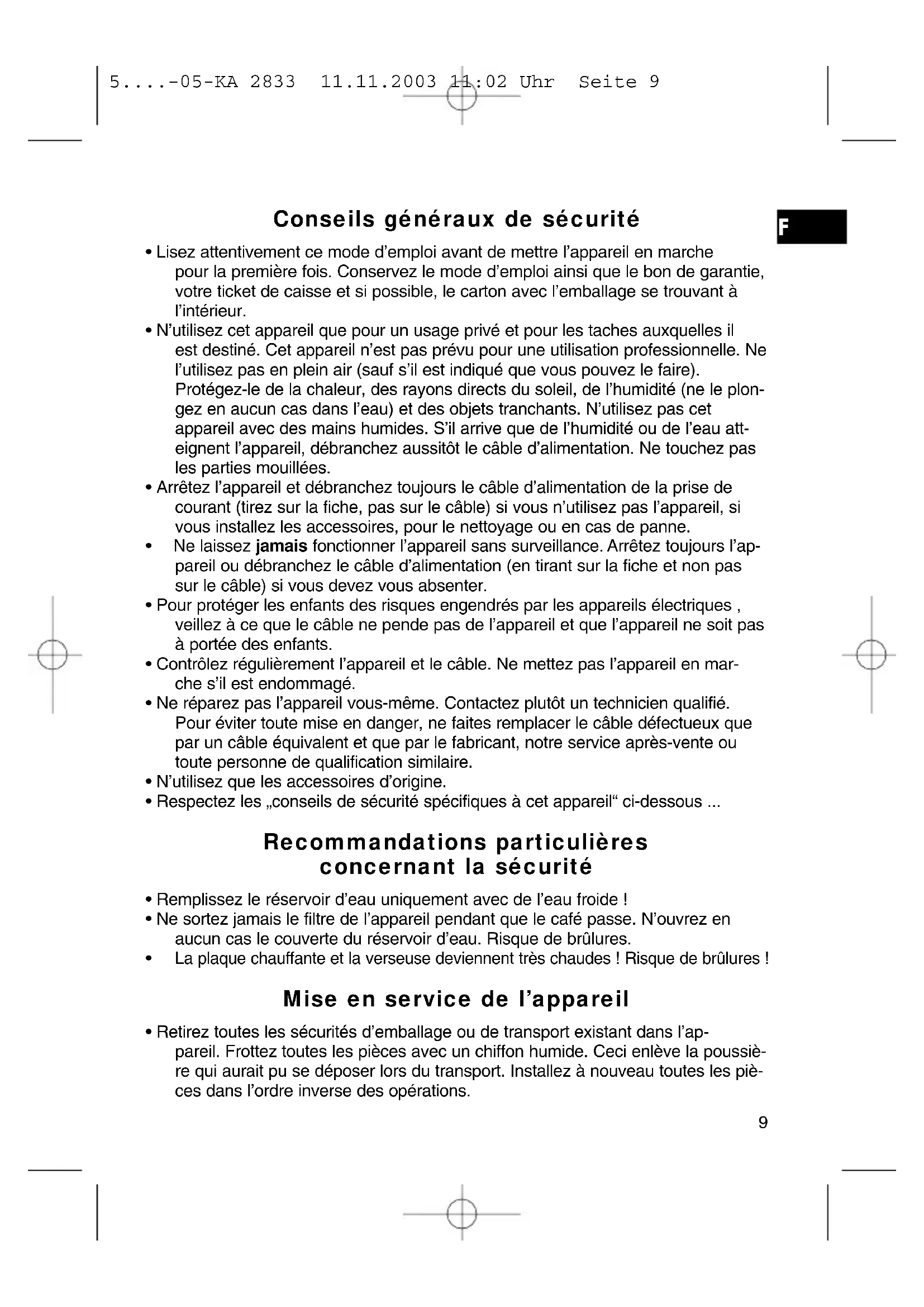 5....-05-KA 2833 11.11.2003 11:02 Uhr Seite 9• Avant de faire votre premier café, veuillez faire passer 2 ou 3 fois de l’eau froide pour nettoyer l’appareil. Alimentation électrique