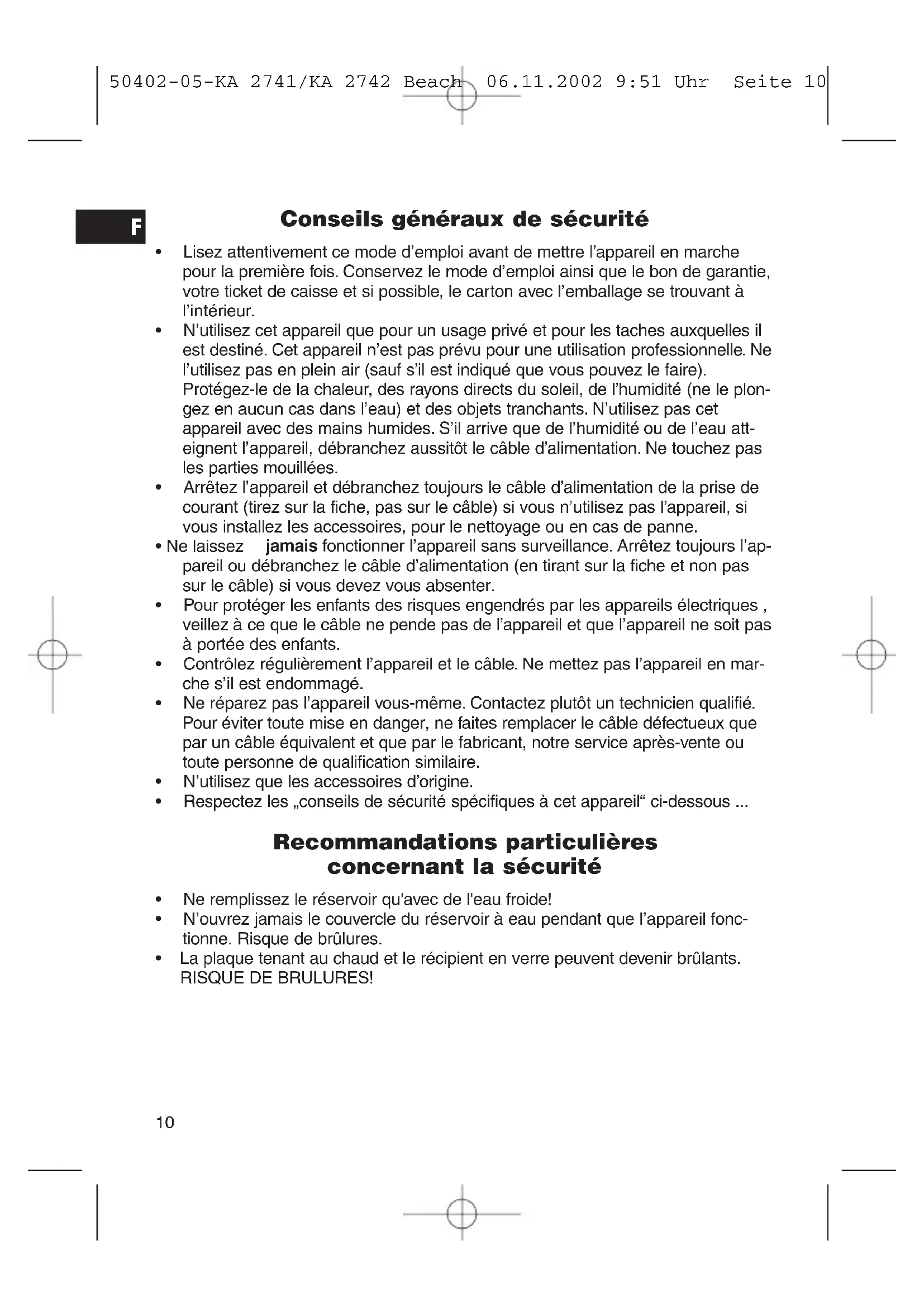 50402-05-KA 2741/KA 2742 Beach 06.11.2002 9:51 Uhr Seite 12Cet appareil a été contrôlé d’après toutes les directives européennes actuelles applicables, comme par exemple concernant la compatibilité électromagnétique et la basse tension. Cet appareil a été fabriqué en respect des réglementations tech- niques de sécurité les plus récentes. Sous réserve de modifications techniques. Garantie Nous accordons une garantie de 24 mois à dater de la date d’achat (ticket de caisse) pour l’appareil que nous vendons. Pendant la durée de la garantie, nous éliminons gratuitement les défauts de l’appa- reil ou des accessoires *) découlant d’un vice de matériau ou de fabrication au moyen d’une réparation ou, selon notre estimation, au moyen d’un remplacement. Les prestations dans le cadre de la garantie n’entraînent aucune prorogation de la durée de garantie et ne donnent pas droit à une nouvelle garantie ! Le justificatif de garantie est le reçu. Sans ce justificatif, aucun remplacement gratuit ni aucune réparation gratuite ne peuvent être effectués. En cas de recours à la garantie, ramenez votre appareil complet, dans son emballage d'origine, accompagné de votre preuve d'achat, à votre revendeur. *) Les endommagements de pièces d’accessoires ne justifient pas automatique- ment l’échange gratuit de l’appareil complet. Contactez alors notre centrale télépho- nique! La casse de pièces en verre ou en plastique est dans tous les cas à votre charge! Les défauts sur les accessoires ou les pièces d’usure (p.ex. les charbons de moteurs, crochets, courroies d’entraînement, télécommande de rechange, brosses à dents de rechange, lames de scies etc.) ainsi que le nettoyage, l’entretien ou le remplacement de pièces d’usure ne sont pas garantis et sont donc payants ! En cas d’intervention étrangère, la garantie devient caduque. Après la garantie Après écoulement de la durée de garantie, les réparations peuvent être effectuées, contre paiement, par le commerce spécialisé ou le service de réparation.