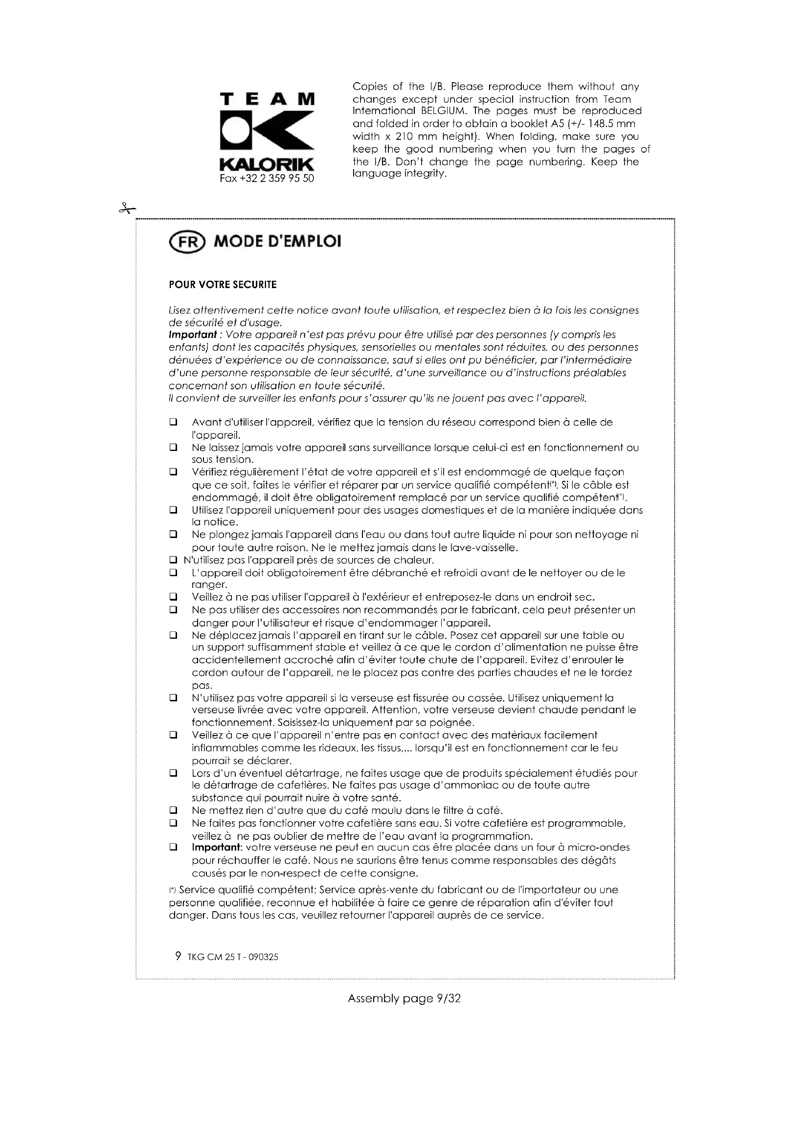 Fax +32 2 359 95 50 aux ordures ménagères. L'utilisateur a le droit de déposer l'appareil dans des lieux publics de collecte procédant à un tri sélectif des déchets pour être soit recyclé, soit réutilisé pour d’autres applications conformément à la directive. Copies of the I/B. Please reproduce them without any changes except under special instruction from Team International BELGIUM. The pages must be reproduced and folded in order to obtain a booklet A5 (+/- 148.5 mm width x 210 mm height). When folding, make sure you keep the good numbering when you turn the pages of the I/B. Don’t change the page numbering. Keep the language integrity.