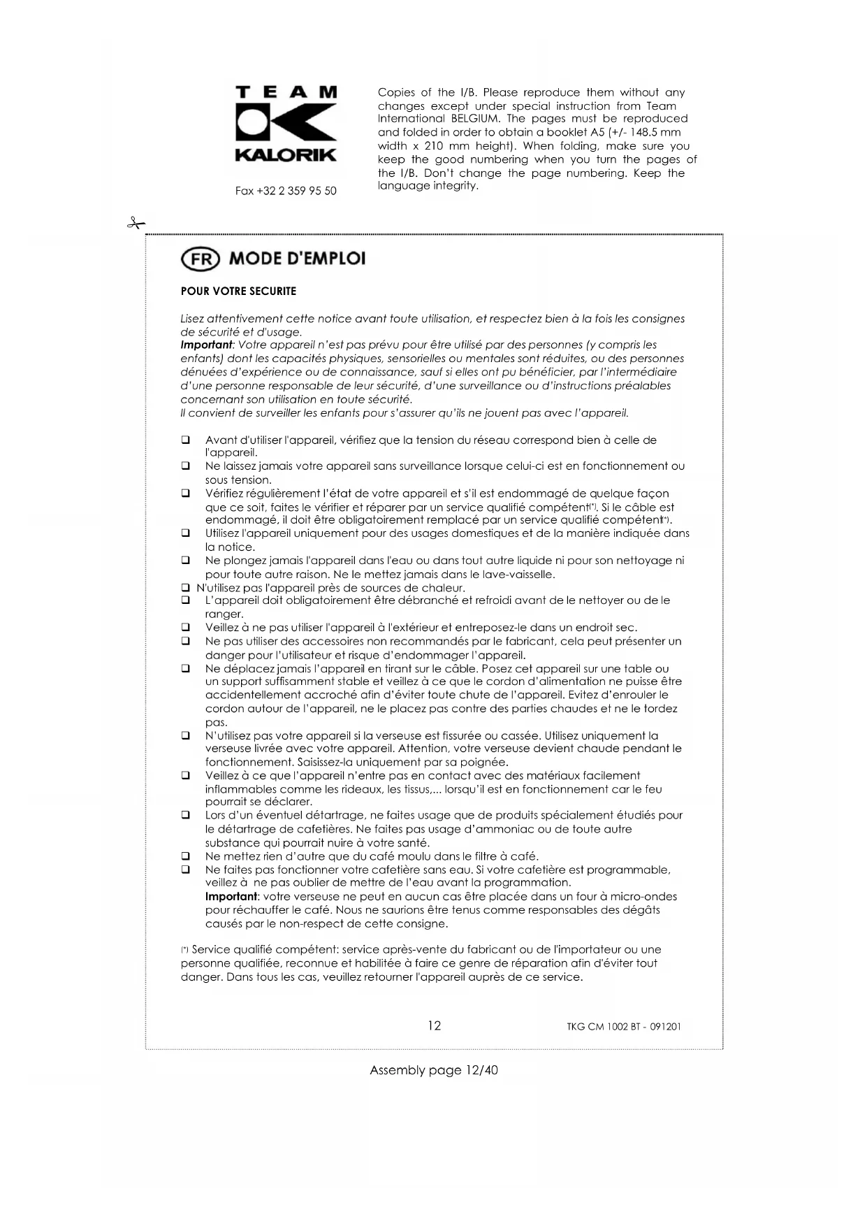 Afin de préserver notre environnement et notre santé, l’élimination en fin de vie des appareils électriques et électroniques doit se faire selon des règles bien précises et nécessite l’implication de chacun, qu’il soit fournisseur ou utilisateur. C’est pour cette raison que votre appareil, tel que le signale le symbole apposé sur sa plaque signalétique ou sur l'emballage, ne doit en aucun cas être jeté dans une poubelle publique ou privée destinée aux ordures ménagères. L'utilisateur a le droit de déposer l'appareil dans des lieux publics de collecte procédant à un tri sélectif des déchets pour être soit recyclé, soit réutilisé pour d’autres applications conformément à la directive. Copies of the I/B. Please reproduce them without any changes except under special instruction from Team International BELGIUM. The pages must be reproduced and folded in order to obtain a booklet A5 (+/- 148.5 mm width x 210 mm height). When folding, make sure you keep the good numbering when you turn the pages of the I/B. Don’t change the page numbering. Keep the language integrity.