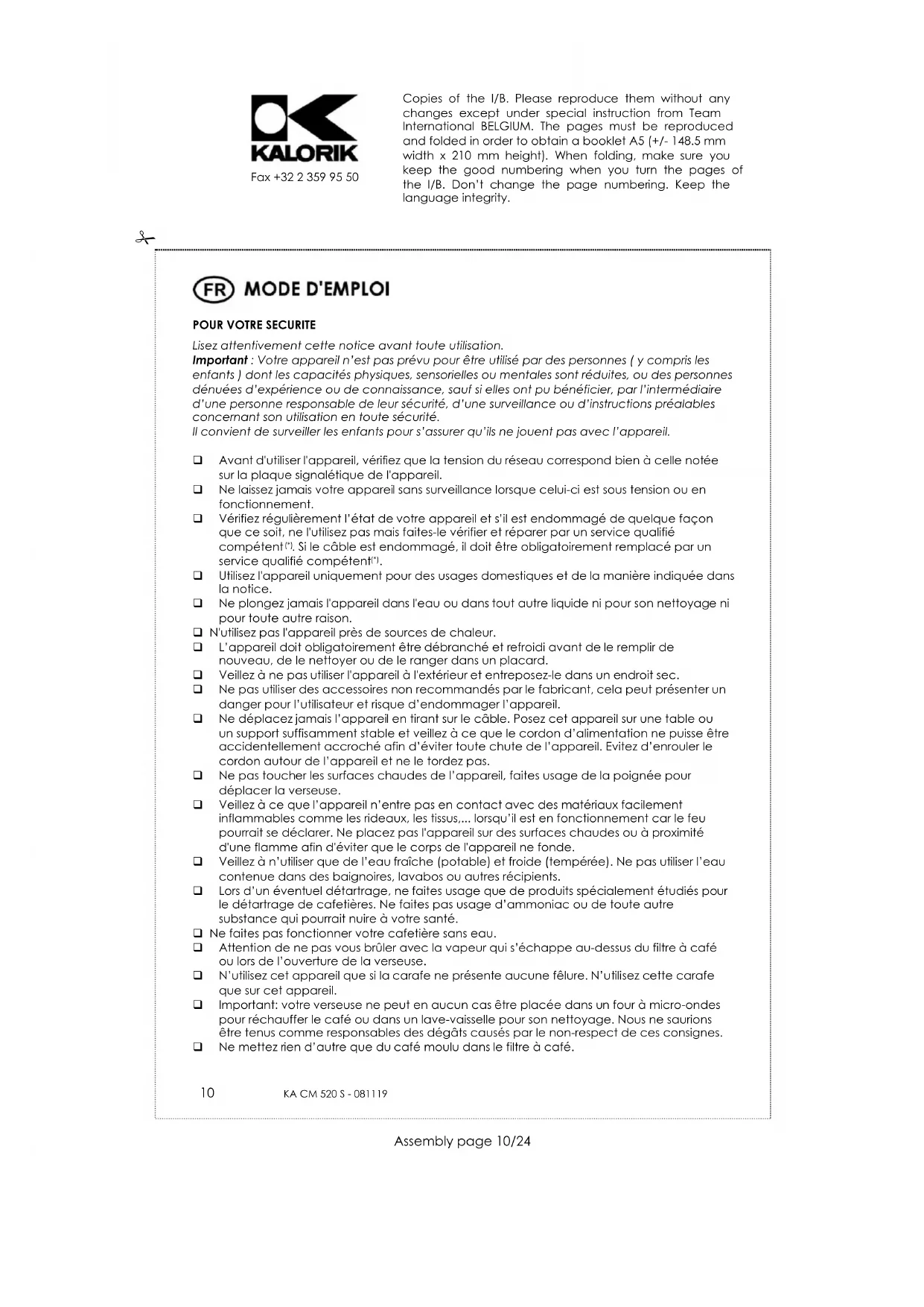 Afin de préserver notre environnement et notre santé, l’élimination en fin de vie des appareils électriques et électroniques doit se faire selon des règles bien précises et nécessite l’implication de chacun, qu’il soit fournisseur ou utilisateur. C’est pour cette raison que votre appareil, tel que le signale le symbole apposé sur sa plaque signalétique ou sur l'emballage, ne doit en aucun cas être jeté dans une poubelle publique ou privée destinée aux ordures ménagères. L'utilisateur a le droit de déposer l'appareil gratuitement dans des lieux publics de collecte procédant à un tri sélectif des déchets pour être soit recyclé, soit réutilisé pour d’autres applications conformément à la directive. Copies of the I/B. Please reproduce them without any changes except under special instruction from Team International BELGIUM. The pages must be reproduced and folded in order to obtain a booklet A5 (+/- 148.5 mm width x 210 mm height). When folding, make sure you keep the good numbering when you turn the pages of the I/B. Don’t change the page numbering. Keep the language integrity. 13 KA CM 520 S - 081119