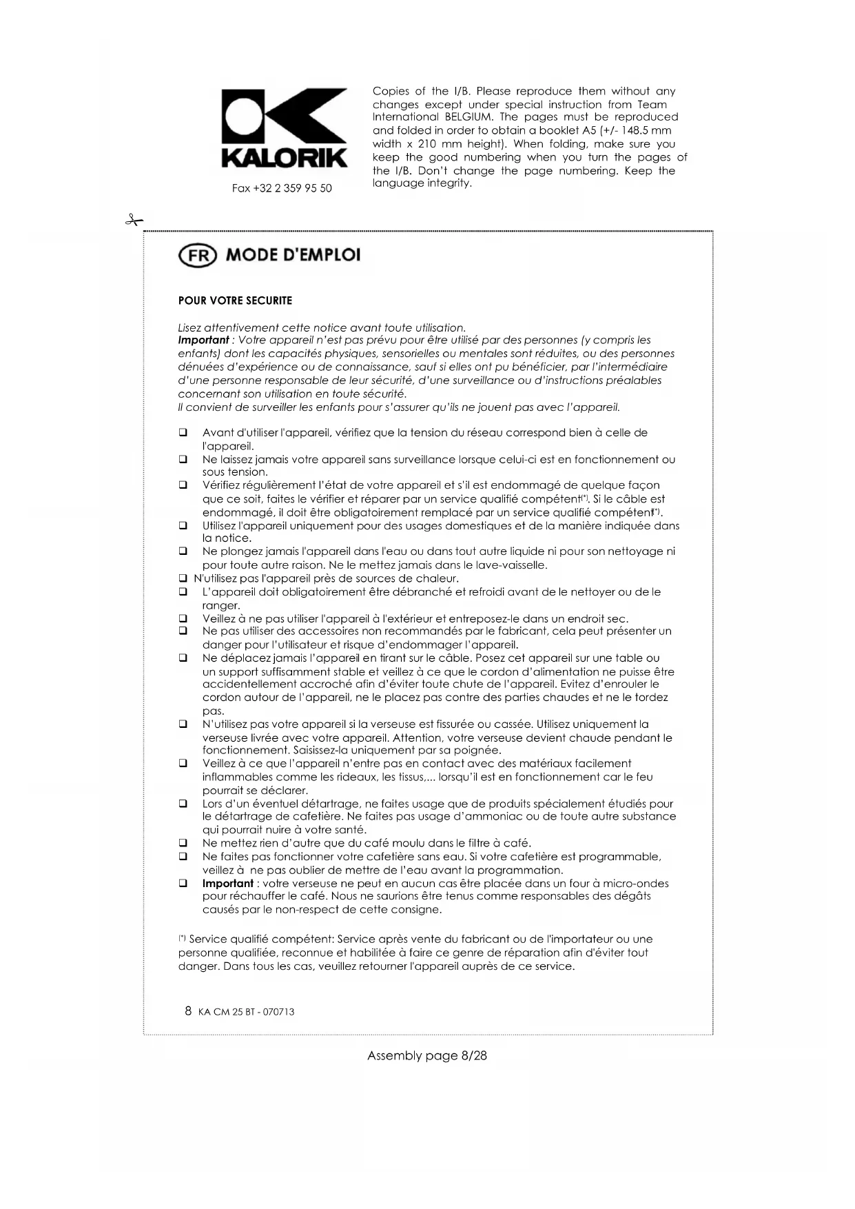 Service qualifié compétent: Service après vente du fabricant ou de l'importateur ou une personne qualifiée, reconnue et habilitée à faire ce genre de réparation afin d'éviter tout danger. Dans tous les cas, veuillez retourner l'appareil auprès de ce service. Copies of the I/B. Please reproduce them without any changes except under special instruction from Team International BELGIUM. The pages must be reproduced and folded in order to obtain a booklet A5 (+/- 148.5 mm width x 210 mm height). When folding, make sure you keep the good numbering when you turn the pages of the I/B. Don’t change the page numbering. Keep the language integrity. 9 KA CM 25 BT - 070713