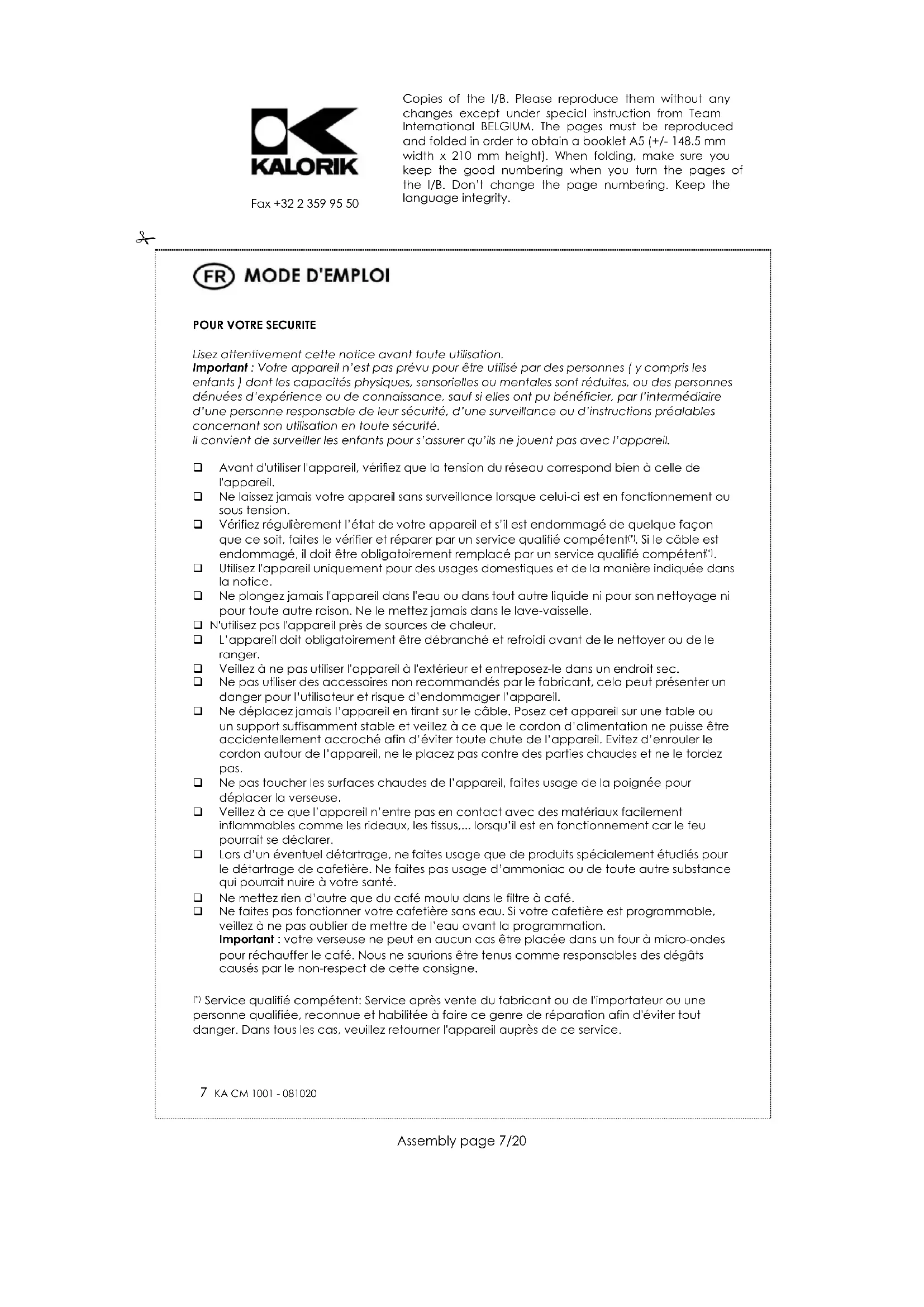 Service qualifié compétent: Service après vente du fabricant ou de l'importateur ou une personne qualifiée, reconnue et habilitée à faire ce genre de réparation afin d'éviter tout danger. Dans tous les cas, veuillez retourner l'appareil auprès de ce service. Copies of the I/B. Please reproduce them without any changes except under special instruction from Team International BELGIUM. The pages must be reproduced and folded in order to obtain a booklet A5 (+/- 148.5 mm width x 210 mm height). When folding, make sure you keep the good numbering when you turn the pages of the I/B. Don’t change the page numbering. Keep the language integrity. 8 KA CM 1001 - 081020