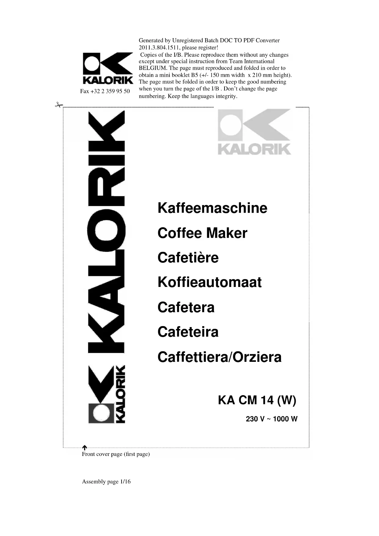 MODE D'EMPLOI KA CM 14 W KALORIK