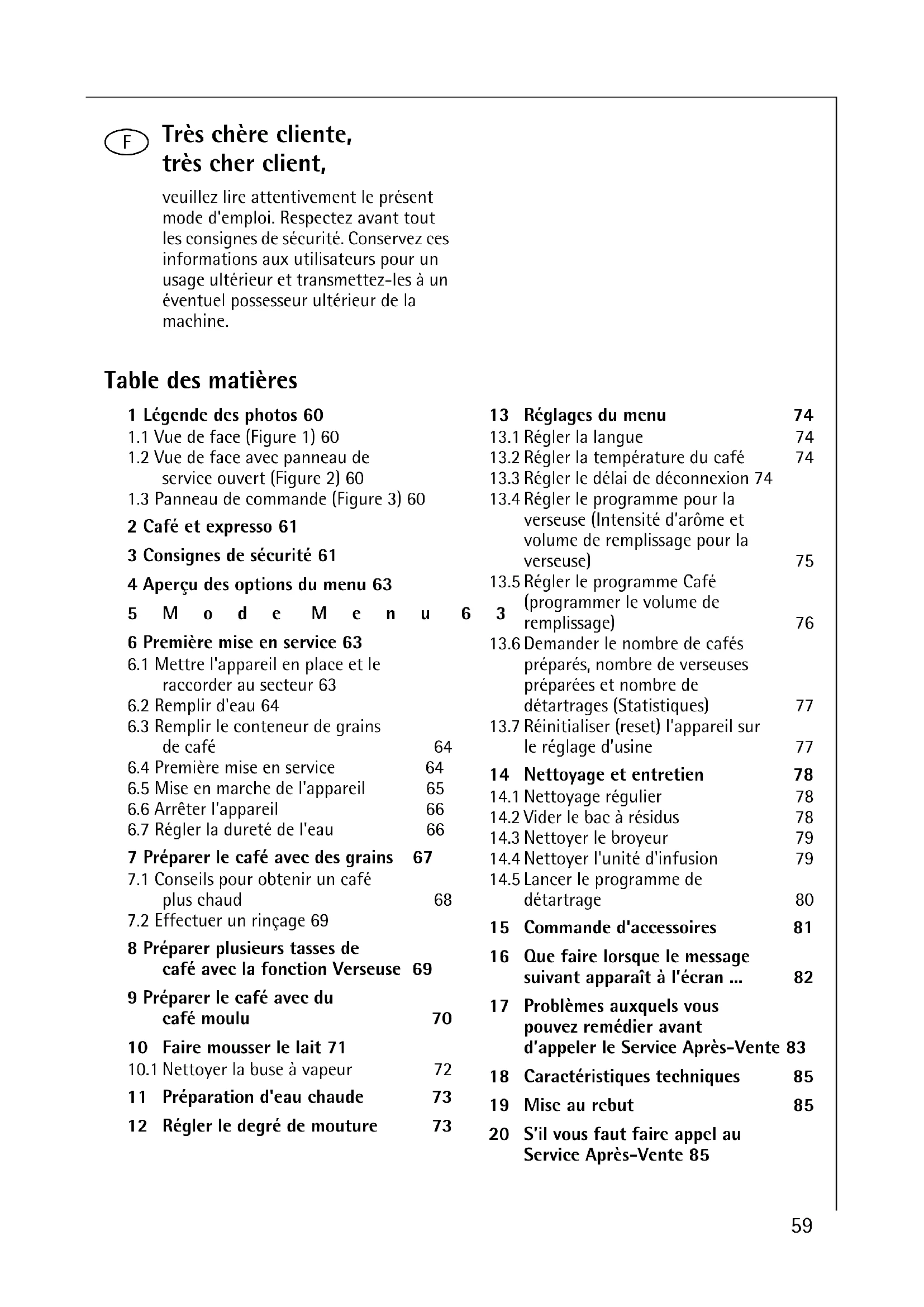 2 Café et expresso 61 3 Consignes de sécurité 61 4 Aperçu des options du menu 63 5Mode Menu 63 6 Première mise en service 63