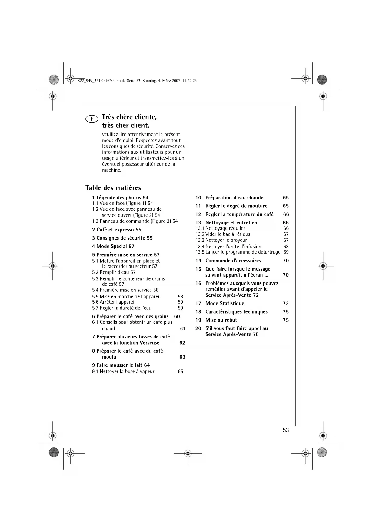 14 Commande d'accessoires 70 15 Que faire lorsque le message suivant apparaît à l’écran ... 70 16 Problèmes auxquels vous pouvez remédier avant d’appeler le Service Après-Vente 72 17 Mode Statistique 73 18 Caractéristiques techniques 75 19 Mise au rebut 75 20 S’il vous faut faire appel au Service Après-Vente 75 822_949_351 CG6200.book Seite 53 Sonntag, 4. März 2007 11:22 23f
