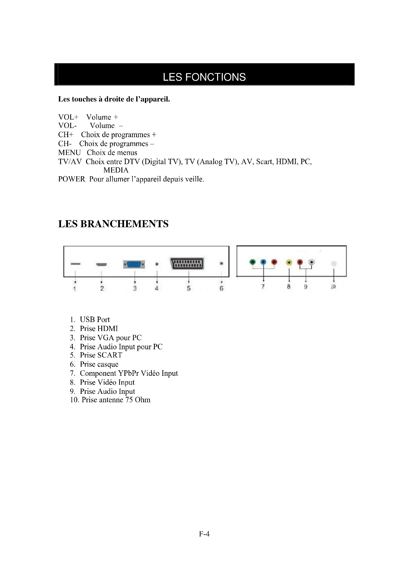 LES FONCTIONS Les touches à droite de l’appareil. VOL+ Volume + VOL- Volume – CH+ Choix de programmes + CH- Choix de programmes – MENU Choix de menus TV/AV Choix entre DTV (Digital TV), TV (Analog TV), AV, Scart, HDMI, PC, MEDIA POWER Pour allumer l’appareil depuis veille.