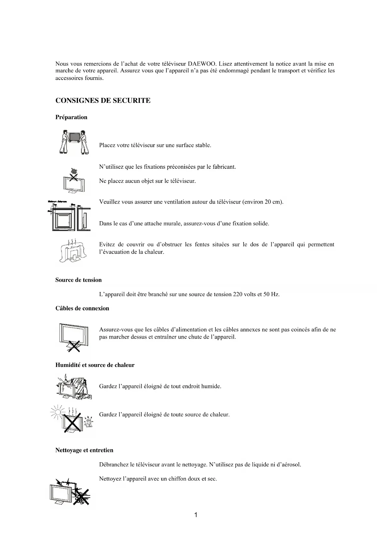 MODE D’EMPLOI: DSL19T2WCNous vous remercions de l’achat de votre téléviseur DAEWOO. Lisez attentivement la notice avant la mise en marche de votre appareil. Assurez vous que l’appareil n’a pas été endommagé pendant le transport et vérifiez les accessoires fournis.