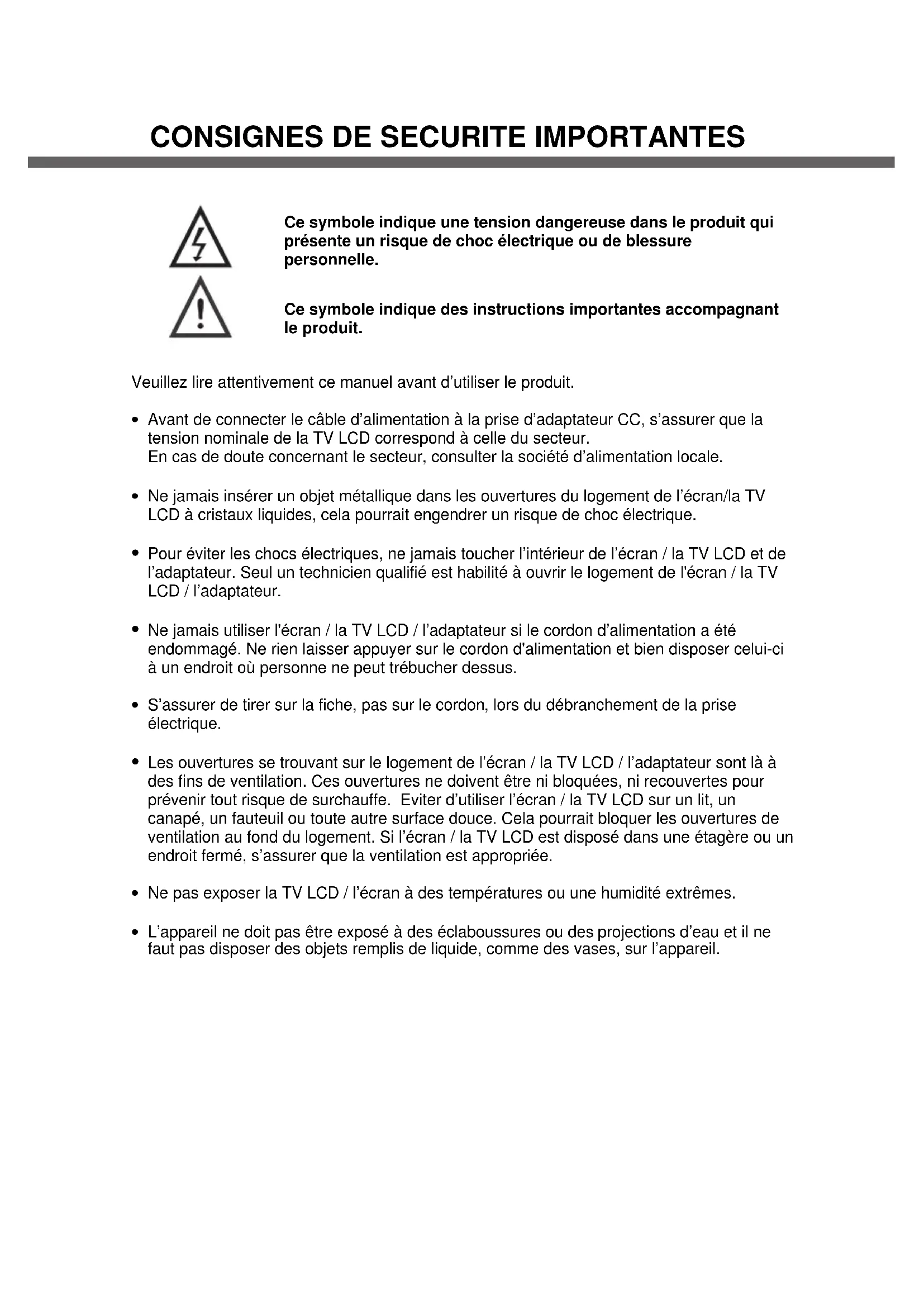 - Pour éviter les chocs électriques, ne jamais toucher l'intérieur de l'écran / la TV LCD et de l'adaptateur. Seul un technicien qualifié est habilité à ouvrir le logement de l'écran / la TV LCD / l'adaptateur.