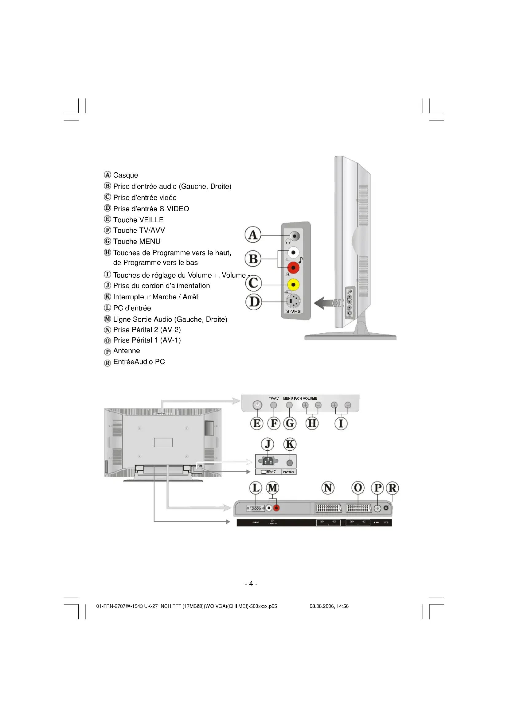 220V-240V AC~50 HzPOWER Casque Prise d'entrée audio (Gauche, Droite) Prise d'entrée vidéo Prise d'entrée S-VIDEO Touche VEILLE Touche TV/AVV Touche MENU Touches de Programme vers le haut, de Programme vers le bas Touches de réglage du Volume +, Volume - Prise du cordon d'alimentation Interrupteur Marche / Arrêt PC d'entrée Ligne Sortie Audio (Gauche, Droite) Prise Péritel 2 (AV-2) Prise Péritel 1 (AV-1) Antenne EntréeAudio PC 01-FRN-2707W-1543 UK-27 INCH TFT (17MB08)(WO VGA)(CHI MEI)-500xxxx.p65 08.08.2006, 14:564- 5 - Installation Installez l'écran sur une surface horizontale, telle qu'une table ou un bureau. Pour garantir la ventilation, vous devez con- server un espace libre de 10 cm tout autour de l'appareil. Pour éviter tout dommage ou situation d'insécurité, ne posez aucun objet sur l'appareil. Cet appareil peut être utilisé dans des cli- mats de type tropical et/ou modéré. Caractéristiques
