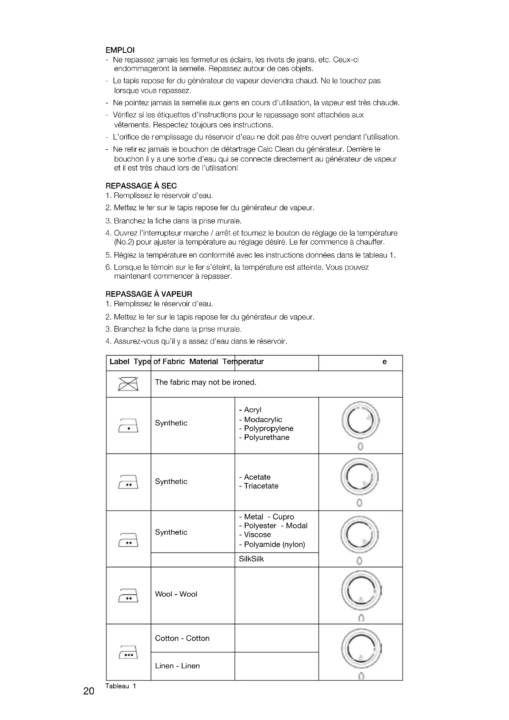 Pendant ce temps réglez la température en tour nant le bouton de réglage de la température du fer sur le réglage désiré. Réglez la température en conformité avec les instructions données dans le tableau 1.