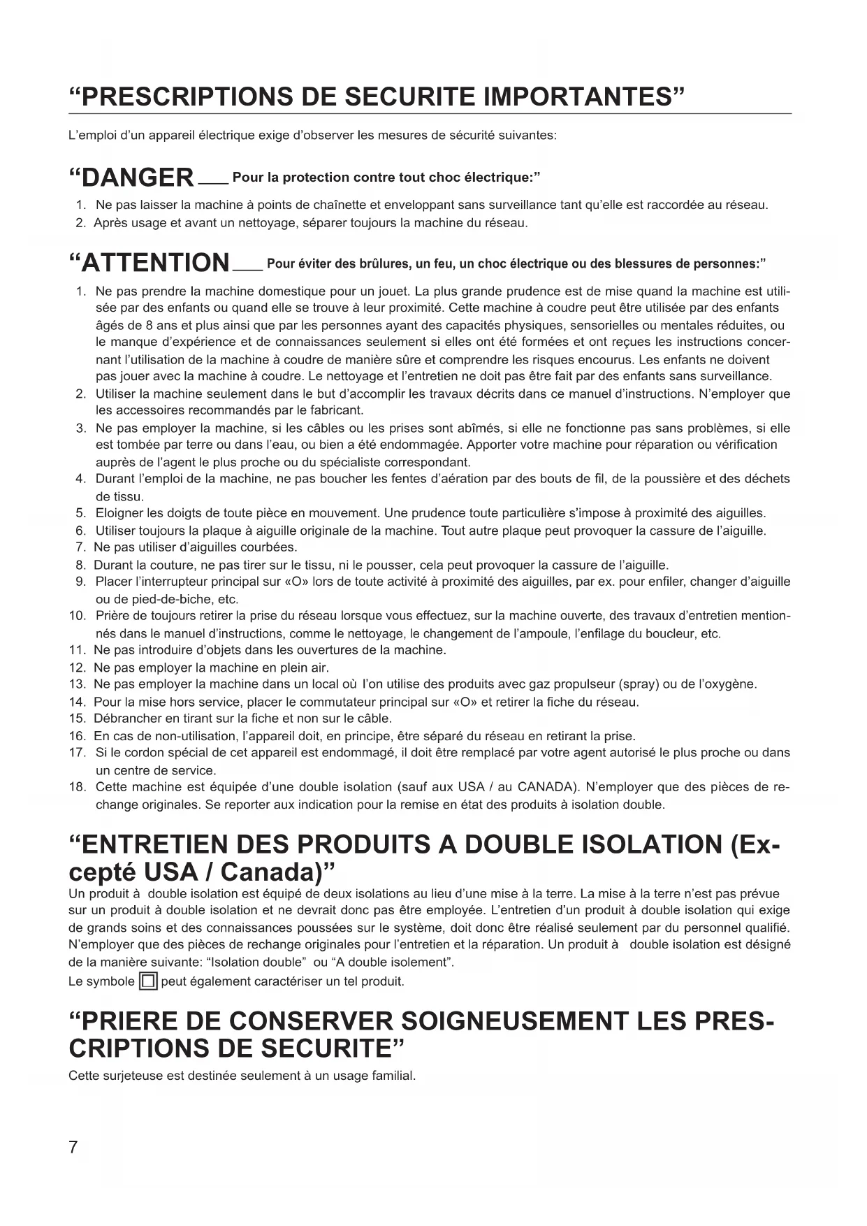 L’emploi d’un appareil électrique exige d’observer les mesures de sécurité suivantes: “DANGER ____ Pour la protection contre tout choc électrique:”