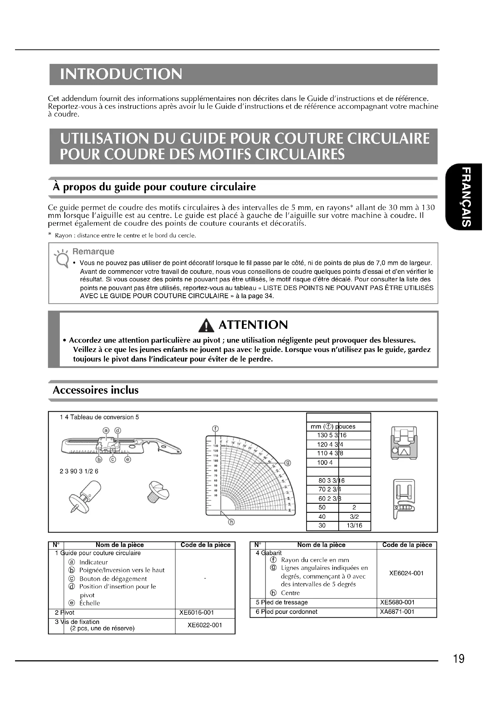 - Accordez une attention particulière au pivot ; une utilisation négligente peut provoquer des blessures. Veillez à ce que les jeunes enfants ne jouent pas avec le guide. Lorsque vous n’utilisez pas le guide, gardez toujours le pivot dans l’indicateur pour éviter de le perdre.1 4 Tableau de conversion 5mm (f) pouces130 5 3/16120 4 3/4110 4 3/8100 42 3 90 3 1/2 680 3 3/1670 2 3/460 2 3/8 40 3/230 13/16N° Nom de la pièce Code de la pièce1 Guide pour couture circulairea Indicateurb Poignée/Inversion vers le hautc Bouton de dégagementd Position d’insertion pour le pivote Échelle 2 Pivot XE6016-0013 Vis de fixation (2 pcs, une de réserve)XE6022-0014 Gabaritf Rayon du cercle en mmg Lignes angulaires indiquées en degrés, commençant à 0 avec des intervalles de 5 degrésh CentreXE6024-0015 Pied de tressage XE5680-0016 Pied pour cordonnet XA6871-001N° Nom de la pièce Code de la pièce20 Fixation du guide pour couture circulaire