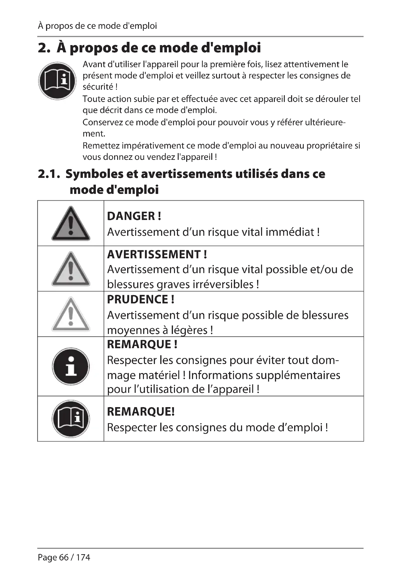 Avant d'utiliser l'appareil pour la première fois, lisez attentivement le présent mode d'emploi et veillez surtout à respecter les consignes de sécurité ! Toute action subie par et effectuée avec cet appareil doit se dérouler tel que décrit dans ce mode d'emploi. Conservez ce mode d'emploi pour pouvoir vous y référer ultérieure- ment. Remettez impérativement ce mode d'emploi au nouveau propriétaire si vous donnez ou vendez l'appareil ! 2.1. Symboles et avertissements utilisés dans ce mode d'emploi DANGER! Avertissement d’un risque vital immédiat ! AVERTISSEMENT! Avertissement d’un risque vital possible et/ou de blessures graves irréversibles ! PRUDENCE! Avertissement d’un risque possible de blessures moyennes à légères ! REMARQUE! Respecter les consignes pour éviter tout dom- mage matériel ! Informations supplémentaires pour l’utilisation de l’appareil ! REMARQUE! Respecter les consignes du mode d’emploi ! 16600 ML eCommerce Content MSN 5005 0244 final.indb 6616600 ML eCommerce Content MSN 5005 0244 final.indb 66 24.06.2015 09:41:4924.06.2015 09:41:49Page 67 / 174 À propos de ce mode d'emploi