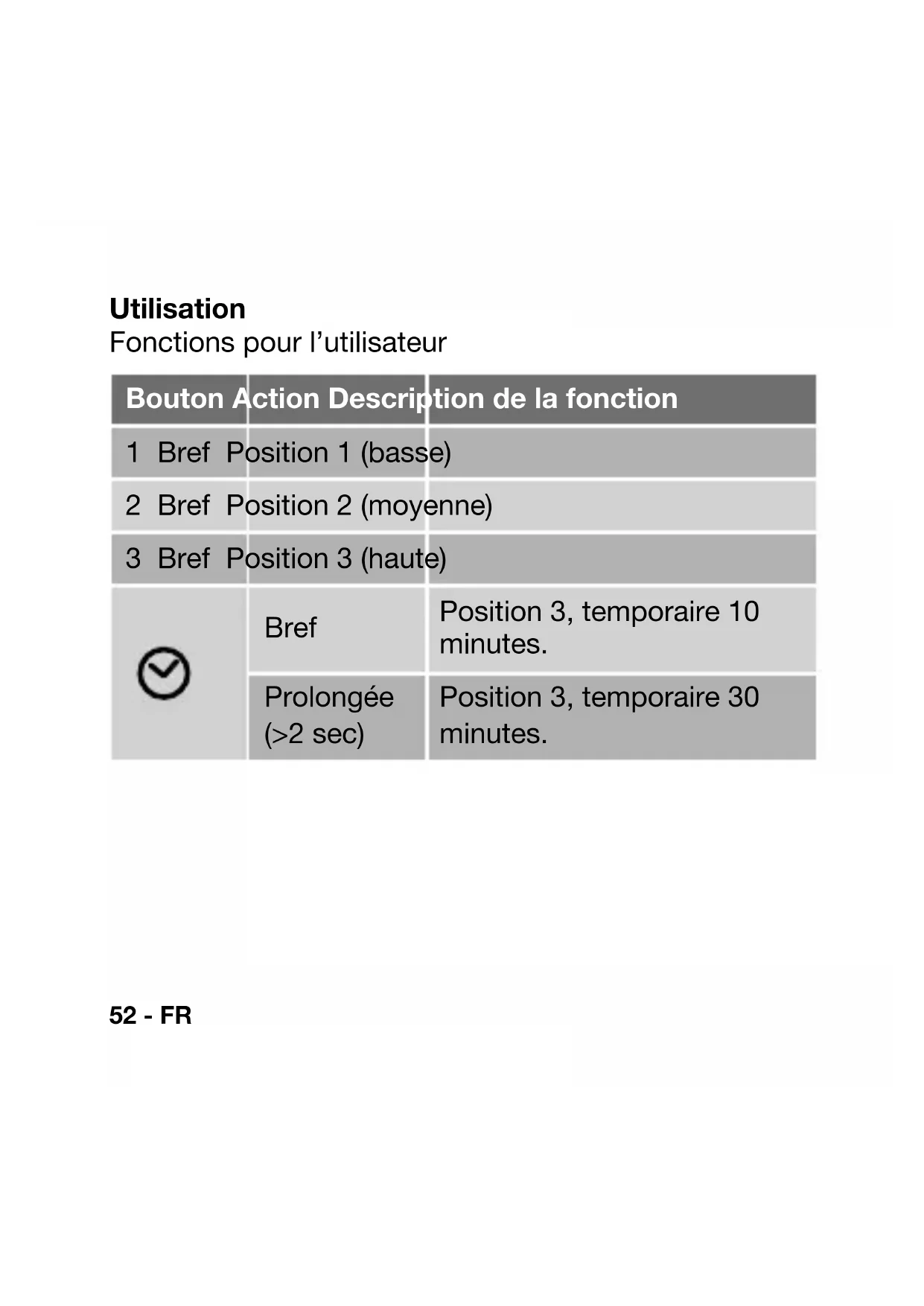 Fig. 752 - FR Utilisation Fonctions pour l’utilisateur Bouton Action Description de la fonction 1 Bref Position 1 (basse) 2 Bref Position 2 (moyenne) 3 Bref Position 3 (haute) Bref Position 3, temporaire 10 minutes. Prolongée (>2 sec) Position 3, temporaire 30 minutes.FR - 53 Fonctions pour l’installateur Mise au point entre l’appareil de ventilation et l'interrupteur RFZ En standard 1 ou plusieurs interrupteurs sur 1 appareil de ventilation