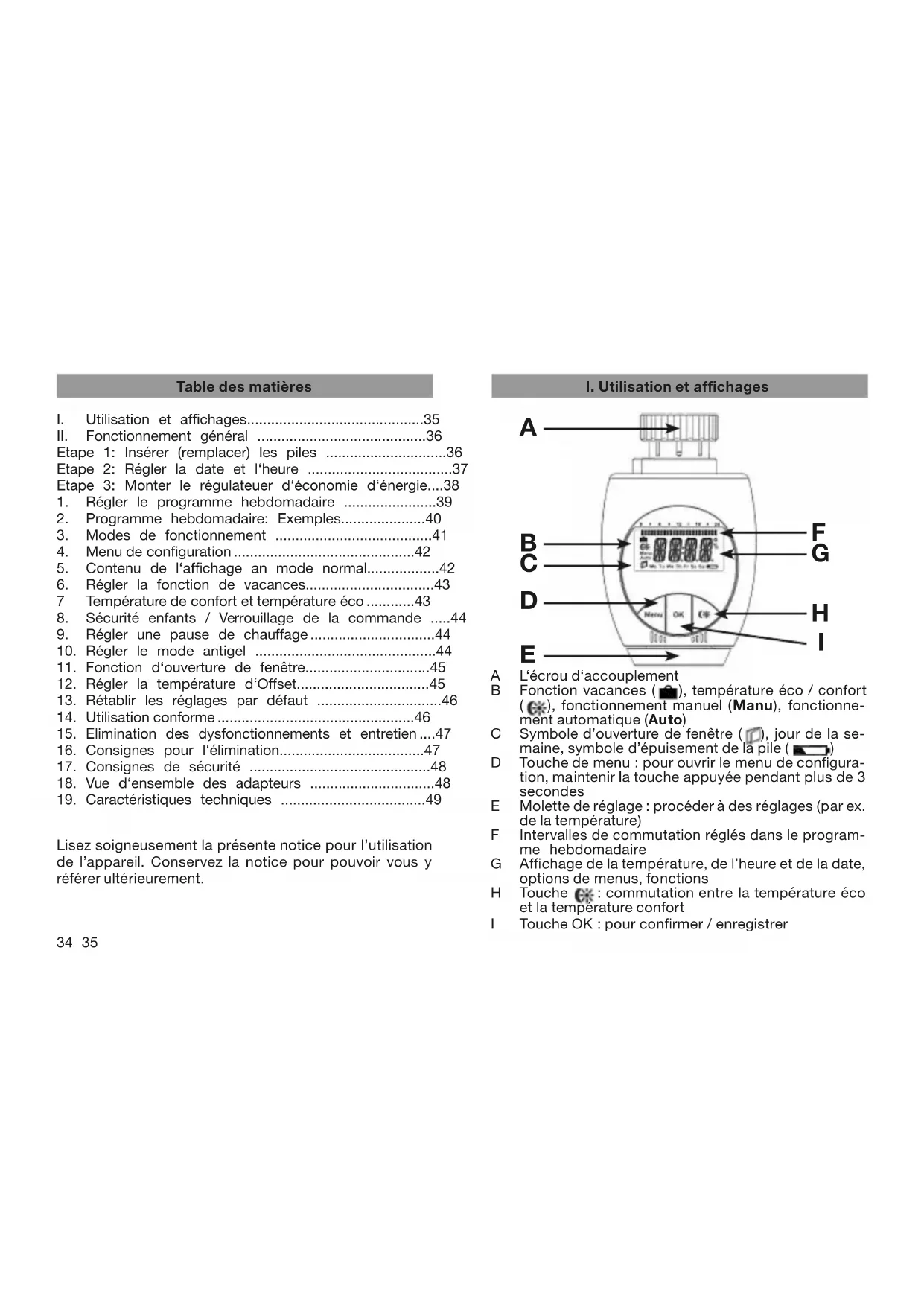 A L‘écrou d‘accouplement B Fonction vacances ( ), température éco / confort ( ), fonctionnement manuel (Manu), fonctionne- ment automatique (Auto) C Symbole d’ouverture de fenêtre ( ), jour de la se- maine, symbole d’épuisement de la pile ( ) D Touche de menu : pour ouvrir le menu de congura- tion, maintenir la touche appuyée pendant plus de 3 secondes E Molette de réglage : procéder à des réglages (par ex. de la température) F Intervalles de commutation réglés dans le program- me hebdomadaire G Af chage de la température, de l’heure et de la date, options de menus, fonctions H Touche : commutation entre la température éco et la température confort I Touche OK : pour conrmer / enregistrer Table des matières
