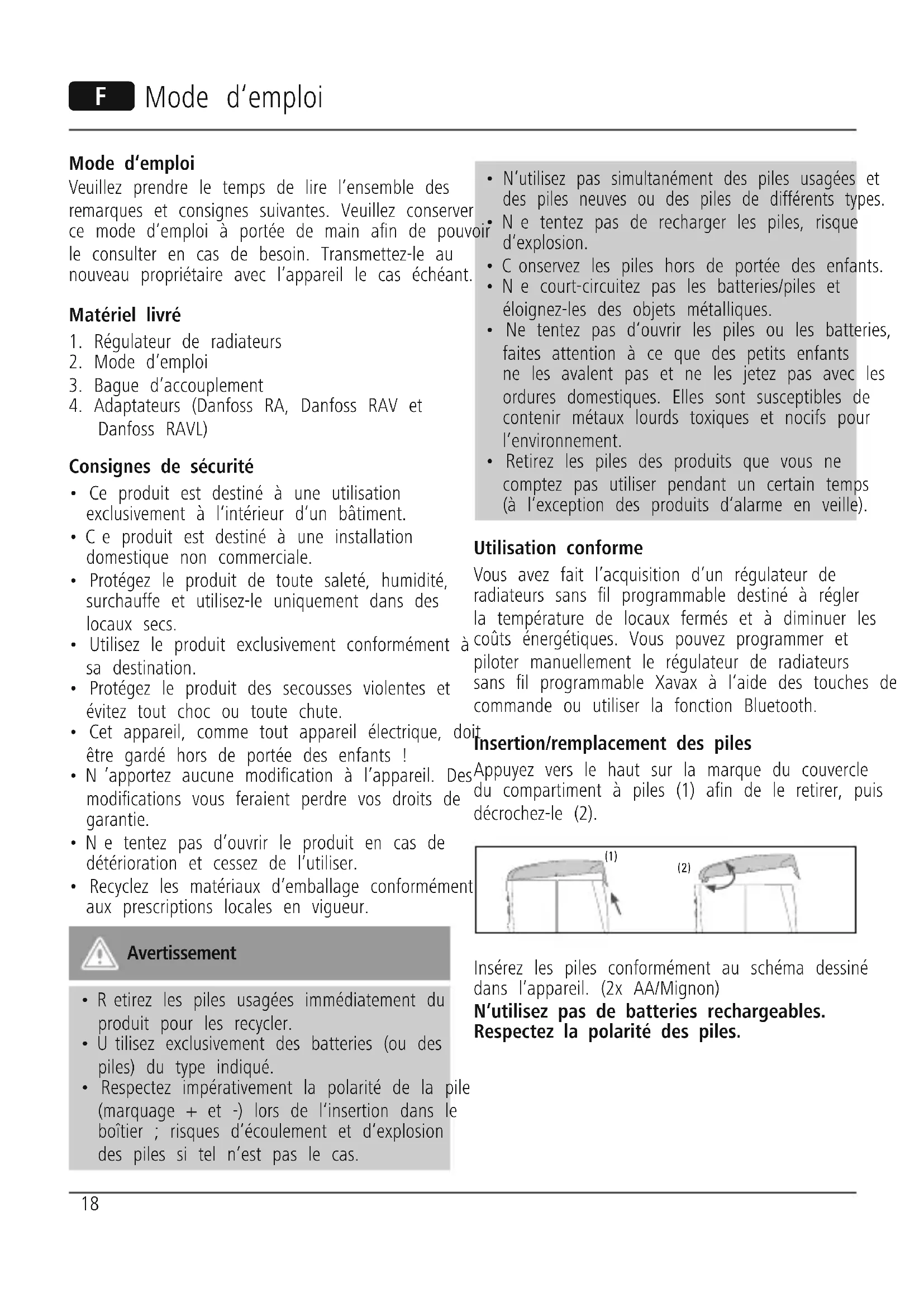 - Retirez les piles des produits que vous ne comptez pas utiliser pendant un certain temps (à l‘exception des produits d‘alarme en veille). Utilisation conforme Vous avez fait l’acquisition d’un régulateur de radiateurs sans l programmable destiné à régler la température de locaux fermés et à diminuer les coûts énergétiques. Vous pouvez programmer et piloter manuellement le régulateur de radiateurs sans l programmable Xavax à l’aide des touches de commande ou utiliser la fonction Bluetooth. Insertion/remplacement des piles Appuyez vers le haut sur la marque du couvercle du compartiment à piles (1) an de le retirer, puis décrochez-le (2). (2) (1) Insérez les piles conformément au schéma dessiné dans l’appareil. (2x AA/Mignon) N‘utilisez pas de batteries rechargeables. Respectez la polarité des piles.19 Réglage de la date et de l’heure Les chiffres de l’année clignotent après avoir inséré les piles lors de la première mise en service. Vous pouvez alors régler la date et l’heure. Réglage de l’année à l’aide de la molette. Conrmez votre saisie à l’aide de la touche.
